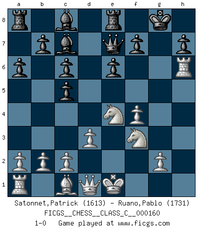Last move : 1-0 2011 March 26 0:53:54 [Event "FICGS__CHESS__CLASS_C__000160"] [Site "FICGS"] [Date "2010.10.25"] [Round "1"] [White "Satonnet,Patrick"] [Black "Ruano,Pablo"] [Result "1-0"] [WhiteElo "1613"] [BlackElo "1731"] 1.e4 c5 2.f4 e6 3.Nf3 Nc6 4.Bb5 Nf6 5.Nc3 a6 6.Bxc6 dxc6 7.h4 Bd6 8.e5 Bc7 9.exf6 Qxf6 10.d3 O-O 11.h5 Re8 12.Ne4 Qe7 13.h6 gxh6 14.Rxh6 1-0 This chess game has been lost on time (started : 2010.10.25 15:48:8) Sicilian : Grand Prix attack Kingside Castling by player Black (move 10) Player White won this chess game. Follow this game move after move (download)During a Chess competition a Chessmaster should be a combination of a beast of prey and a monk. (Alexander Alekhine) Smyslow ist ein Beweis dafür, dass ich noch zehn Jahre spielen kann! [der 75 jährige über den 85 jährigen] (Viktor Kortschnoi) En el tablero, la mentira e hipocresía no sobreviven mucho. (Emanuel Lasker) Donnez-moi un Cavalier en 6e et je gagnerais toutes mes parties. (Steinitz) Fortune favours the audacious. (Desiderius Erasmus)
