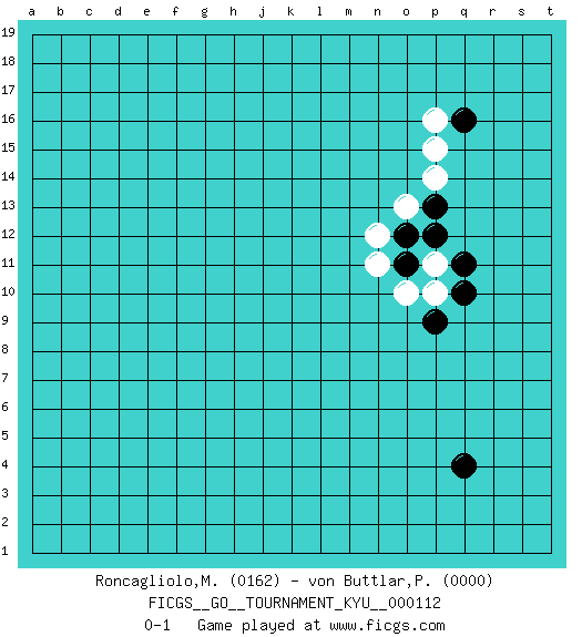 Last move : 0-1 2010 December 5 10:27:29 [Event "FICGS__GO__TOURNAMENT_KYU__000112"] [Site "FICGS"] [Date "2010.10.25"] [Round "1"] [Black "Roncagliolo,Marco"] [White "von Buttlar,Paul"] [Result "0-1"] [Rating 1 "0162"] [Rating 2 "0000"] 1.q16 p15 2.q4 p16 3.q10 p14 4.p13 o13 5.p12 p11 6.o12 n12 7.o11 n11 8.q11 p10 9.p9 o10 0-1 This go game has been lost on time (started : 2010.10.25 17:23:47) Here are the names of the openings (joseki) played in the four corners : Corner q16 : q16 p15 Hoshi (Hwajeom, Seongjeom, Xingwei`) 4-4 Point. The star or hoshi (4-4) point, emphasizing influence at the potential expense of territory. Player White won this Go (weiqi, baduk) game. Follow this game move after move (download)Capture what you cut off. (Anonymous) The only sure thing about luck is that it will change. (Wilson Mizner)
