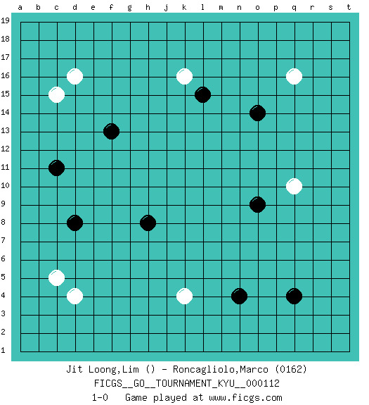 Last move : 1-0 2011 January 1 11:6:34 [Event "FICGS__GO__TOURNAMENT_KYU__000112"] [Site "FICGS"] [Date "2010.10.25"] [Round "1"] [Black "Jit Loong,Lim"] [White "Roncagliolo,Marco"] [Result "1-0"] [Rating 2 "0162"] 1.q4 d16 2.o9 d4 3.c11 q16 4.l15 q10 5.d8 k16 6.o14 k4 7.f13 c15 8.n4 c5 9.h8 1-0 This go game has been lost on time (started : 2010.10.25 17:23:47) Here are the names of the openings (joseki) played in the four corners : Corner d16 : d16 c11 Hoshi (Hwajeom, Seongjeom, Xingwei`) 4-4 Point. The star or hoshi (4-4) point, emphasizing influence at the potential expense of territory. Corner q16 : q16 l15 Hoshi (Hwajeom, Seongjeom, Xingwei`) 4-4 Point. The star or hoshi (4-4) point, emphasizing influence at the potential expense of territory. Corner d4 : d4 d8 Hoshi (Hwajeom, Seongjeom, Xingwei`) 4-4 Point. The star or hoshi (4-4) point, emphasizing influence at the potential expense of territory. Player Black won this Go (weiqi, baduk) game. Follow this game move after move (download)Keshi is worth as much as an invasion ! (Anonymous) 'preceded by its own quotation yields a falsehood' preceded by its own quotation yields a falsehood. (W. V. O. Quine - Set Theory And Its Logic, 1953)