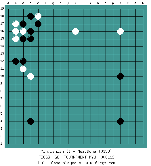 Last move : 1-0 2010 December 25 22:43:54 [Event "FICGS__GO__TOURNAMENT_KYU__000112"] [Site "FICGS"] [Date "2010.10.25"] [Round "1"] [Black "Yin,Wenlin"] [White "Nez,Dona"] [Result "1-0"] [Rating 2 "0139"] 1.d4 q16 2.q4 k16 3.d16 d10 4.q10 d17 5.c17 c16 6.c15 b16 7.e17 e18 8.d18 b17 9.d15 b15 10.c12 c11 11.b12 1-0 This go game has been lost on time (started : 2010.10.25 17:23:47) Here are the names of the openings (joseki) played in the four corners : Corner d16 : d16 d17 Hoshi (Hwajeom, Seongjeom, Xingwei`) 4-4 Point. The star or hoshi (4-4) point, emphasizing influence at the potential expense of territory. Corner d4 : d4 1-0 Hoshi (Hwajeom, Seongjeom, Xingwei`) 4-4 Point. The star or hoshi (4-4) point, emphasizing influence at the potential expense of territory. Player Black won this Go (weiqi, baduk) game. Follow this game move after move (download)Only amateurs try to come up with fancy moves. (Anonymous) Nothing is more important for teaching us to understand the concepts we have than constructing fictitious ones. (Ludwig Wittgenstein)