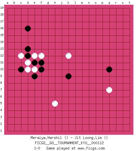 Last move : 1-0 2010 December 18 22:42:15 [Event "FICGS__GO__TOURNAMENT_KYU__000112"] [Site "FICGS"] [Date "2010.10.25"] [Round "1"] [Black "Meraiya,Harshil"] [White "Jit Loong,Lim"] [Result "1-0"] 1.d16 d11 2.q10 q7 3.d12 h5 4.k9 k12 5.e11 d10 6.c10 e10 7.f10 e12 8.f11 f12 9.e9 c12 10.d13 1-0 This go game has been lost on time (started : 2010.10.25 17:23:47) Here are the names of the openings (joseki) played in the four corners : Corner d16 : d16 d11 Hoshi (Hwajeom, Seongjeom, Xingwei`) 4-4 Point. The star or hoshi (4-4) point, emphasizing influence at the potential expense of territory. Corner d4 : h5 e9 This joseki is unknown. A weak or weird move has probably been played in this corner. Player Black won this Go (weiqi, baduk) game. Follow this game move after move (download)It is difficult to know exactly what you are doing. (Pierre Audouard) Always two there are. No more no less. A master, and an apprentice. (Master Yoda in Star Wars ep.1)