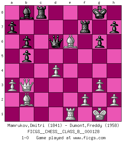 Last move : 1-0 2011 March 31 22:17:1 [Event "FICGS__CHESS__CLASS_B__000128"] [Site "FICGS"] [Date "2010.10.25"] [Round "1"] [White "Mamrukov,Dmitri"] [Black "Dumont,Freddy"] [Result "1-0"] [WhiteElo "1841"] [BlackElo "1958"] 1.d4 Nf6 2.c4 c6 3.Nf3 d5 4.Qc2 e6 5.g3 Na6 6.a3 Be7 7.Bg2 O-O 8.O-O b6 9.Nc3 Bb7 10.b4 dxc4 11.Ne5 Nd5 12.Nxc4 Nac7 13.Bb2 Nb5 14.Ne4 Rc8 15.Rac1 f5 16.Ned2 Nd6 17.e4 fxe4 18.Nxd6 Bxd6 19.Bxe4 g6 20.Bg2 Qe7 21.Rfe1 Qd7 22.Bh3 Rce8 23.Nc4 Bc7 24.Re2 Bc8 25.Rce1 Qe7 26.Ne3 Qd6 27.b5 Nxe3 28.Rxe3 cxb5 29.Rc3 Bb8 30.Rxc8 Rxc8 31.Qb3 Rf7 32.Bxe6 1-0 Queen's pawn game Kingside Castling by player Black (move 7) Kingside Castling by player White (move 8) Player White won this chess game. Follow this game move after move (download)If you aren't afraid of Spassky, then I have removed the element of money. (Jim Slater) Im Schach nämlich geht es darum, daß Ich des Gegners klein zu kriegen, sein Ego zu zerbrechen und zu zermahlen, seine Selbstachtung zu zertreten und zu verscharren und seine ganze mißachtenswerte sogenannte Persönlichkeit ein für alle Mal tot zu hacken und zu zerstampfen und dadurch die menschliche Gesellschaft von einer stinkenden Pestbeule zu befreien. Es ist ein königliches Spiel. (Robert James Fischer) ¿Porque tengo que perder ante este idiota?. (Aron Nimzovich) Les échecs sont plus proches de l'art de l'assassinat que de l'art de la guerre. (Arturo Perez-Reverte) For to win one hundred victories in one hundred battles is not the acme of skill. To subdue the enemy without fighting is the acme of skill. (Sun Tzu)