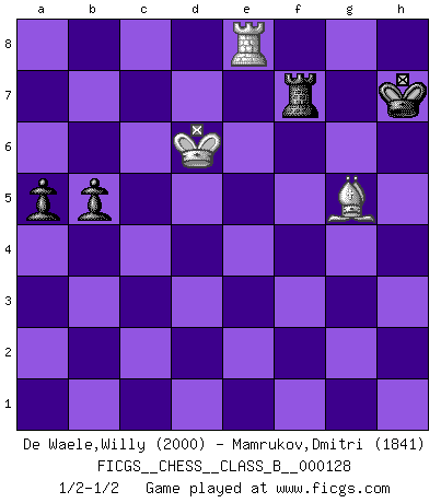 Last move : 1/2-1/2 2010 November 23 11:37:6 [Event "FICGS__CHESS__CLASS_B__000128"] [Site "FICGS"] [Date "2010.10.25"] [Round "1"] [White "De Waele,Willy"] [Black "Mamrukov,Dmitri"] [Result "1/2-1/2"] [WhiteElo "2000"] [BlackElo "1841"] 1.e4 c5 2.Nf3 g6 3.d4 cxd4 4.Nxd4 Nc6 5.c4 Nf6 6.Nc3 d6 7.Be2 Nxd4 8.Qxd4 Bg7 9.Be3 O-O 10.Qd2 Be6 11.Rc1 Qa5 12.f3 Rfc8 13.b3 a6 14.Na4 Qxd2+ 15.Kxd2 Nd7 16.g4 f5 17.exf5 gxf5 18.h3 Rf8 19.f4 Rad8 20.Nc3 d5 21.cxd5 Nf6 22.Rhg1 Nxd5 23.Nxd5 Bxd5 24.Ke1 fxg4 25.hxg4 b5 26.Kf2 Bd4 27.f5 Bf6 28.Bf3 e6 29.Bb6 Bh4+ 30.Ke2 Bxf3+ 31.Kxf3 Rd2 32.Rc6 Rxa2 33.Rxe6 Rb2 34.Kf4 Rxb3 35.g5 Rc8 36.g6 Rc4+ 37.Ke5 Bg3+ 38.Rxg3 Rxg3 39.Re8+ Kg7 40.f6+ Kh6 41.gxh7 Rg5+ 42.Kd6 Kxh7 43.f7 Rf4 44.Be3 Rxf7 45.Bxg5 a5 1/2-1/2 Sicilian : Hungarian variation Kingside Castling by player Black (move 9) 10 pieces endgame at move 41 : White KRBPP , Black KRRPP WHITE : King + 1 Rook 1 Bishop 2 Pawns BLACK : King + 2 Rooks 2 Pawns 9 pieces endgame at move 42 : White KRBP , Black KRRPP WHITE : King + 1 Rook 1 Bishop 1 Pawn BLACK : King + 2 Rooks 2 Pawns 8 pieces endgame at move 44 : White KRB , Black KRRPP WHITE : King + 1 Rook 1 Bishop BLACK : King + 2 Rooks 2 Pawns 7 pieces endgame at move 45 : White KRB , Black KRPP WHITE : King + 1 Rook 1 Bishop BLACK : King + 1 Rook 2 Pawns This chess game ended in a draw. Follow this game move after move (download)I have never in my life played the French Defence, which is the dullest of all openings. (Wilhelm Steinitz) Jeder leidlich begabte Spieler, er braucht keineswegs hervorragend veranlagt zu sein, kann es zum Meister bringen. Aber das ist ja auch gar nicht nötig! Der richtige Standpunkt ist es, zu seinem Vergnügen zu spielen, und man glaube ja nicht, dass der Genuss proportional dem Können sei. (Siegbert Tarrasch) Antes de los Finales, los dioses han colocado el Juego Medio. (Siegbert Tarrasch) A chaque perte on perd un peu de soi. (Joël Lautier) Political correctness is subjecting us to gross incompetence. (Johann Piek)