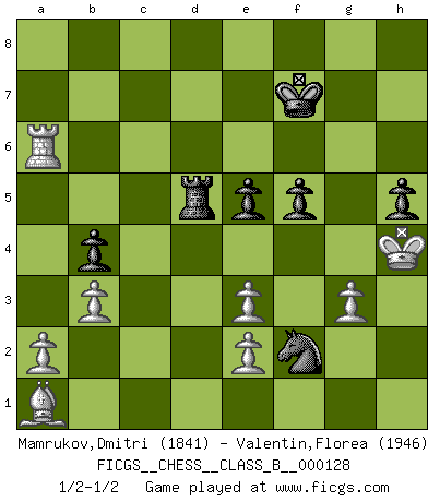 Last move : 1/2-1/2 2011 March 5 19:35:1 [Event "FICGS__CHESS__CLASS_B__000128"] [Site "FICGS"] [Date "2010.10.25"] [Round "1"] [White "Mamrukov,Dmitri"] [Black "Valentin,Florea"] [Result "1/2-1/2"] [WhiteElo "1841"] [BlackElo "1946"] 1.d4 Nf6 2.c4 e6 3.g3 d5 4.Nf3 Be7 5.Bg2 O-O 6.O-O dxc4 7.Ne5 c5 8.dxc5 Qc7 9.Nxc4 Qxc5 10.b3 Rd8 11.Qc2 Nc6 12.Ba3 Nb4 13.Qc1 Rb8 14.Qf4 Bd7 15.Nc3 Be8 16.Rac1 Nh5 17.Qe3 Qxe3 18.Nxe3 f5 19.Na4 b6 20.Rc7 Rd7 21.Rxd7 Bxd7 22.Rd1 Nf6 23.Nb2 Bb5 24.Nbc4 Bc5 25.Rd2 Be8 26.h3 Rc8 27.Bb2 b5 28.Na5 Rc7 29.Nb7 Bxe3 30.fxe3 Bc6 31.Bxc6 Nxc6 32.Bxf6 Rxb7 33.Ba1 Ne7 34.Rd8+ Kf7 35.Kf2 Nd5 36.Kf3 Nf6 37.Bd4 h5 38.h4 b4 39.Rd6 Ne4 40.Ra6 g5 41.hxg5 Nxg5+ 42.Kf4 Nh3+ 43.Ke5 Nf2 44.Bxa7 Rb5+ 45.Kf4 Nh3+ 46.Kf3 Ng5+ 47.Kg2 Ne4 48.Bd4 e5 49.Ba1 Rd5 50.Kh3 Nf2+ 51.Kh4 Ne4 52.Kh3 Nf2+ 53.Kh4 1/2-1/2 Catalan Opening Kingside Castling by player Black (move 5) Kingside Castling by player White (move 6) This chess game ended in a draw. Follow this game move after move (download)A Chess game is a dialogue, a conversation between a player and his opponent. Each move by the opponent may contain threats or be a blunder, but a player cannot defend against threats or take advantage of blunders if he does not first ask himself: What is my opponent planning after each move ? (Bruce A. Moon) Ich bin der einzige Schachspieler, der sich während der Vorbereitungen zum Turnier verletzt hat. (Woody Allen) Cada Peón es potencialmente una Reina. (James Mason) Comme les marins qui ont mille raisons différentes d'aller en mer, les joueurs d'échecs en ont tout autant avant de s'installer devant une table et jouer... (Vincent Bertignac, philosophe) Wisdom is the reward you get for a lifetime of listening when you'd have preferred to talk. (Doug Larson)