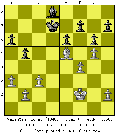Last move : 0-1 2011 July 15 20:22:38 [Event "FICGS__CHESS__CLASS_B__000128"] [Site "FICGS"] [Date "2010.10.25"] [Round "1"] [White "Valentin,Florea"] [Black "Dumont,Freddy"] [Result "0-1"] [WhiteElo "1946"] [BlackElo "1958"] 1.e4 c5 2.Nf3 d6 3.d4 cxd4 4.Nxd4 Nf6 5.Nc3 e6 6.Be2 Be7 7.O-O O-O 8.Be3 a6 9.f4 Nc6 10.Qe1 Nxd4 11.Bxd4 b5 12.a3 Bb7 13.Qg3 g6 14.Qe3 Rc8 15.Bf3 d5 16.exd5 Bxd5 17.Nxd5 Nxd5 18.Bxd5 Qxd5 19.c3 Qf5 20.Rad1 Rfd8 21.Qe5 Qxe5 22.Bxe5 Kf8 23.g4 Rxd1 24.Rxd1 Rd8 25.Rxd8+ Bxd8 26.g5 Ke8 27.Kf2 Kd7 0-1 This chess game has been lost on time (started : 2010.10.25 23:10:30) Sicilian : Scheveningen, 6.Be2 Kingside Castling by player White (move 7) Kingside Castling by player Black (move 7) Player Black won this chess game. Follow this game move after move (download)Pawns: they are the soul of this game, they alone form the attack and defense. (Philidor) Über die Verhaftung Bobby Fischers: Warum es die Bush-Administration für nötig befindet einen 61 Jahre alten Mann zu hetzten, der für niemanden ausser sich selbste eine Gefahr darstellt ist ein Rätsel. (Nigel Short) La esencia del Ajedrez es pensar acerca de lo que el Ajedrez es. (David Bronstein) Les pièces de l'échiquier étaient impitoyables. Elles le retenaient, elles l'absorbaient. Il y avait de l'horreur en cela, mais aussi une harmonie unique. Car, qu'y a-t-il dans le monde, à part les échecs ? (V. Nabokov) The good fighters of old first put themselves beyond the possibility of defeat, and then waited for an opportunity of defeating the enemy. (Sun Tzu)