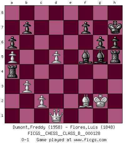 Last move : 0-1 2011 June 17 17:42:25 [Event "FICGS__CHESS__CLASS_B__000128"] [Site "FICGS"] [Date "2010.10.25"] [Round "1"] [White "Dumont,Freddy"] [Black "Flores,Luis"] [Result "0-1"] [WhiteElo "1958"] [BlackElo "1848"] 1.e4 c5 2.Nf3 d6 3.d4 cxd4 4.Nxd4 Nf6 5.Nc3 a6 6.Be2 e5 7.Nb3 Be7 8.O-O O-O 9.Be3 Be6 10.Qd2 Nbd7 11.a4 Nb6 12.a5 Nc4 13.Bxc4 Bxc4 14.Rfd1 Rc8 15.Nc1 Qc7 16.Nd3 Be6 17.Bb6 Qc4 18.f3 Bd8 19.Be3 Qc7 20.Qf2 h6 21.Qe1 Re8 22.Qg3 Qb8 23.h3 Be7 24.Ra4 Bd7 25.R4a1 Be6 26.Nb4 Qc7 27.Rd2 Kh7 28.Kh1 Qc4 29.Nd3 Bd7 30.Qe1 Bd8 31.R2d1 d5 32.exd5 e4 33.Nc5 Rxc5 34.Rd4 exf3 35.Rxc4 fxg2+ 36.Kxg2 Rxc4 37.b3 Rc8 38.Qd2 Bf5 39.Bb6 Ne4 40.Qf4 g6 41.Nxe4 Rxe4 42.Qf2 Bh4 43.Qd2 Bg5 44.Qd1 Rc3 45.Bd4 Rxh3 46.Bf2 Rh5 47.Ra4 Rxa4 0-1 This chess game has been lost on time (started : 2010.10.25 23:10:30) Sicilian : Najdorf, Opovcensky variation Kingside Castling by player White (move 8) Kingside Castling by player Black (move 8) Player Black won this chess game. Follow this game move after move (download)For surely of all the drugs in the world, Chess must be the most permanently pleasurable. (Assiac) Gewinnen beim Schach fördert das Selbstvertrauen. Beim Sex spüre ich sowas nicht... (Garry Kasparov) Muchos se han convertido en Maestros de Ajedrez, nadie se ha convertido en el Maestro del Ajedrez. (Siegbert Tarrasch) La conception d'un plan est le processus par lequel un joueur exploite les avantages de sa position tout en s'efforçant d'en réduire au minimum les inconvénients. Afin de garantir le succès, un plan doit toujours se fonder sur un diagnostic objectif des particularités d'une position. La conception d'un plan est d'autant plus difficile que la position est équilibrée, et grandement facilitée lorsqu'il n'existe qu'un seul plan susceptible de répondre aux exigences de la position. (Harry Golombek) There are two major products that came out of Berkeley: LSD and UNIX. We do not believe this is to be a coincidence. (Jeremy S. Anderson)