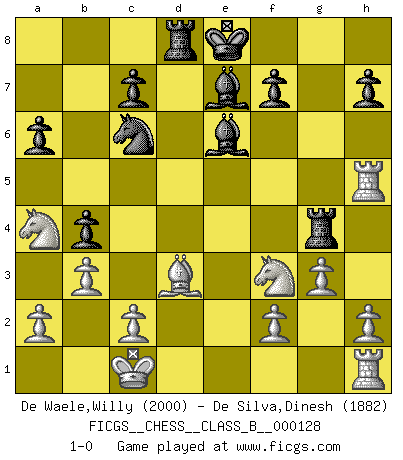 Last move : 1-0 2011 April 18 16:2:31 [Event "FICGS__CHESS__CLASS_B__000128"] [Site "FICGS"] [Date "2010.10.25"] [Round "1"] [White "De Waele,Willy"] [Black "De Silva,Dinesh"] [Result "1-0"] [WhiteElo "2000"] [BlackElo "1882"] 1.e4 e6 2.d4 d5 3.Nc3 Nf6 4.Bg5 dxe4 5.Nxe4 Be7 6.Bxf6 gxf6 7.Nf3 f5 8.Nc3 a6 9.Qe2 b5 10.O-O-O b4 11.Na4 Qd5 12.Qc4 Qxc4 13.Bxc4 Rg8 14.g3 Nc6 15.d5 Rg4 16.b3 Na5 17.Be2 exd5 18.Rxd5 Nc6 19.Bd3 Be6 20.Rxf5 Rd8 21.Rh5 1-0 This chess game has been lost on time (started : 2010.10.25 23:10:30) French : Burn variation Queenside Castling by player White (move 10) Player White won this chess game. Follow this game move after move (download)The hardest game to win is a won game. (Emanuel Lasker) Nach Morphy wurde nichts neues mehr in der Behandlung offener Positionen gefunden. (Mikhail Moiseyevich Botvinik) Las combinaciones han sido siempre el aspecto más intrigante del Ajedrez. Los Maestros las buscan, el público las aplauden, los críticos las alaban. La razón se debe a que las combinaciones hacen posible que el Ajedrez sea más que un ejercicio matemático con una carencia de vida. Ellas son la poesía del juego, son del Ajedrez lo que la melodía es de la música. Ellas representan el triunfo de la mente sobre la materia. (Reuben Fine) Il s'avisa de me proposer d'apprendre les échecs qu'il jouait un peu... me voilà forcené des échecs. J'achète un échiquier, je m'enferme dans ma chambre, j'y passe des jours et des nuits à vouloir apprendre par cur toutes les parties. (Jean-Jacques Rousseau, Confessions) Now you put water in a cup, it becomes the cup; You put water into a bottle it becomes the bottle; You put it in a teapot it becomes the teapot. Water can flow or it can crash. Be water, my friend. (Bruce Lee)