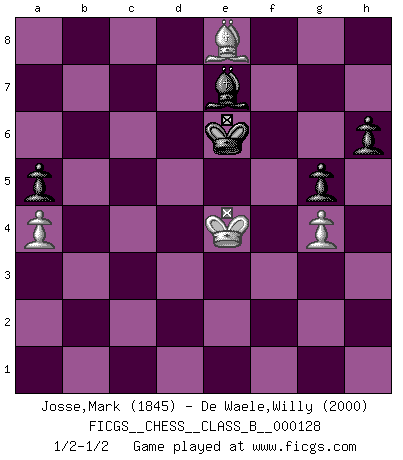 Last move : 1/2-1/2 2010 December 4 13:30:40 [Event "FICGS__CHESS__CLASS_B__000128"] [Site "FICGS"] [Date "2010.10.25"] [Round "1"] [White "Josse,Mark"] [Black "De Waele,Willy"] [Result "1/2-1/2"] [WhiteElo "1845"] [BlackElo "2000"] 1.e4 c5 2.Nf3 d6 3.d4 cxd4 4.Nxd4 Nf6 5.Nc3 a6 6.Bg5 e6 7.f4 Qb6 8.Qd2 Qxb2 9.Rb1 Qa3 10.e5 h6 11.Bxf6 gxf6 12.exd6 Nd7 13.Be2 Qxd6 14.Ne4 Qc7 15.Bh5 Qc4 16.Qe3 Be7 17.f5 Nc5 18.fxe6 Bxe6 19.Nxc5 Qxc5 20.Bf3 O-O 21.O-O Rad8 22.c3 Qg5 23.Qxg5+ fxg5 24.Nxe6 fxe6 25.Bxb7 Bc5+ 26.Kh1 Rxf1+ 27.Rxf1 a5 28.Ba6 Kg7 29.Bc4 e5 30.g4 Rd2 31.Rf5 Be3 32.Rxe5 Rxh2+ 33.Kxh2 Bf4+ 34.Kg2 Bxe5 35.a4 Bxc3 36.Kf3 Kf6 37.Ke4 Be5 38.Bb5 Bf4 39.Be8 Bc7 40.Bb5 Be5 41.Be8 Ke6 42.Bb5 Bd6 43.Be8 Be7 1/2-1/2 Sicilian : Najdorf, 7...Qb6 Kingside Castling by player Black (move 20) Kingside Castling by player White (move 21) 10 pieces endgame at move 34 : White KBPPP , Black KBPPP WHITE : King + 1 Bishop 3 Pawns BLACK : King + 1 Bishop 3 Pawns 9 pieces endgame at move 35 : White KBPP , Black KBPPP WHITE : King + 1 Bishop 2 Pawns BLACK : King + 1 Bishop 3 Pawns This chess game ended in a draw. Follow this game move after move (download)If a ruler does not understand Chess, how can he rule over a kingdom ? (King Khusros II) Stelle das Brett so, daß die Sonne in die Augen deines Gegners scheint. (Ruy López) Todavía soy una víctima del Ajedrez. Tiene toda la belleza del arte y mucho mas. No puede ser comercializado. El Ajedrez es mas puro que el arte en su posición social. (Marcel Duchamp) Des points faibles ou des trous dans la position de l'adversaire doivent être occupés par des pièces et non pas par des pions. (Siegbert Tarrasch) The existence of forgetting has never been proved: We only know that some things don't come to mind when we want them. (Friedrich Nietzsche)
