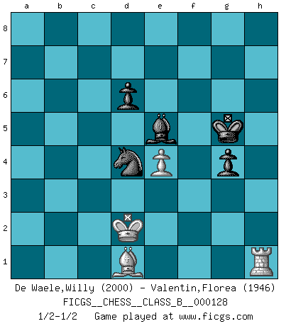 Last move : 1/2-1/2 2010 December 24 14:9:0 [Event "FICGS__CHESS__CLASS_B__000128"] [Site "FICGS"] [Date "2010.10.25"] [Round "1"] [White "De Waele,Willy"] [Black "Valentin,Florea"] [Result "1/2-1/2"] [WhiteElo "2000"] [BlackElo "1946"] 1.e4 c5 2.Nf3 d6 3.d4 cxd4 4.Nxd4 Nf6 5.Nc3 a6 6.Be3 e5 7.Nb3 Be6 8.f3 Be7 9.Qd2 O-O 10.O-O-O Nbd7 11.g4 b5 12.g5 b4 13.Ne2 Ne8 14.f4 a5 15.f5 a4 16.Nbd4 exd4 17.Nxd4 b3 18.Kb1 bxc2+ 19.Nxc2 Bb3 20.axb3 axb3 21.Na3 Ne5 22.h4 Ra4 23.Rh3 Qa8 24.Qd5 Rxa3 25.bxa3 Qxa3 26.Qd2 Nf6 27.gxf6 Bxf6 28.Bd4 Nf3 29.Qb2 Qa2+ 30.Qxa2 bxa2+ 31.Kxa2 Nxd4 32.h5 Be5 33.Rc1 g5 34.hxg6 hxg6 35.fxg6 fxg6 36.Bc4+ Kg7 37.Rch1 Ra8+ 38.Ra3 Rxa3+ 39.Kxa3 g5 40.Kb2 g4 41.Kc3 Nf3 42.Kc2 Kg6 43.Be2 Nd4+ 44.Kd2 Kg5 45.Bd1 1/2-1/2 Sicilian : Najdorf, Byrne (English) attack Kingside Castling by player Black (move 9) Queenside Castling by player White (move 10) 10 pieces endgame at move 38 : White KRBP , Black KRBNPP WHITE : King + 1 Rook 1 Bishop 1 Pawn BLACK : King + 1 Rook 1 Bishop 1 Knight 2 Pawns 9 pieces endgame at move 39 : White KRBP , Black KBNPP WHITE : King + 1 Rook 1 Bishop 1 Pawn BLACK : King + 1 Bishop 1 Knight 2 Pawns This chess game ended in a draw. Follow this game move after move (download)Castle early and often. (Rob Sillars) Garry Kasparov war erst in der Großmeister-Organisation GMA, dann in der Profischach-Vereinigung PCA, zum Schluss kehrte er wieder in den Schoß der FIDE zurück. Aber gut, manche Leute sind flexibel (Viswanathan Anand) Ciertamente, de todas la drogas del mundo, el Ajedrez debe ser el mas placentero permamentemente. (Assiac) Un journaliste : 'Vous préférez avoir une dame de plus sur l'échiquier ou au lit ?' Boris Spassky : 'Ca dépend de la position.' Drag your thoughts away from your troubles... by the ears, by the heels, or any other way you can manage it. (Mark Twain)