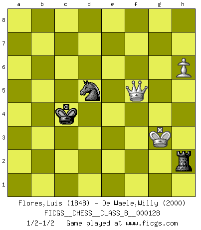 Last move : 1/2-1/2 2010 December 5 12:7:13 [Event "FICGS__CHESS__CLASS_B__000128"] [Site "FICGS"] [Date "2010.10.25"] [Round "1"] [White "Flores,Luis"] [Black "De Waele,Willy"] [Result "1/2-1/2"] [WhiteElo "1848"] [BlackElo "2000"] 1.e4 c5 2.Nf3 d6 3.d4 cxd4 4.Nxd4 Nf6 5.Nc3 a6 6.Bg5 e6 7.f4 Qb6 8.Qd2 Qxb2 9.Rb1 Qa3 10.Be2 Nbd7 11.O-O Be7 12.e5 dxe5 13.fxe5 Nxe5 14.Bxf6 gxf6 15.Ne4 f5 16.Rb3 Qa4 17.Nxf5 exf5 18.Nd6+ Bxd6 19.Qxd6 Qe4 20.Re1 Ng6 21.Bb5+ axb5 22.Rxe4+ fxe4 23.Rxb5 Ne7 24.Rc5 Be6 25.Rc7 Nf5 26.Qb4 Rd8 27.Rxb7 e3 28.Rb8 Rg8 29.Qb6 Rc8 30.Rxc8+ Bxc8 31.Qc7 Ne7 32.Qe5 f5 33.Qxe3 Bb7 34.g3 Rg4 35.Qe5 Bd5 36.Qb8+ Kd7 37.Qb5+ Bc6 38.Qd3+ Ke8 39.Qc3 Bd5 40.Qh8+ Kd7 41.Qxh7 Bxa2 42.Qh8 Be6 43.Kf1 Nd5 44.Kg1 Ke7 45.Qh7+ Kd6 46.Qh6 Re4 47.h4 Rg4 48.c4 Rxc4 49.Qf8+ Ke5 50.h5 f4 51.h6 Rc1+ 52.Kf2 fxg3+ 53.Kxg3 Rc3+ 54.Kf2 Bf5 55.Qb8+ Ke4 56.Qe8+ Kd4 57.Qh8+ Kc4 58.Qe5 Rh3 59.Qxf5 Rh2+ 60.Kg3 1/2-1/2 Sicilian : Najdorf, 7...Qb6 Kingside Castling by player White (move 11) 10 pieces endgame at move 41 : White KQPPP , Black KRBNP WHITE : King + 1 Queen 3 Pawns BLACK : King + 1 Rook 1 Bishop 1 Knight 1 Pawn 9 pieces endgame at move 48 : White KQPP , Black KRBNP WHITE : King + 1 Queen 2 Pawns BLACK : King + 1 Rook 1 Bishop 1 Knight 1 Pawn 8 pieces endgame at move 52 : White KQP , Black KRBNP WHITE : King + 1 Queen 1 Pawn BLACK : King + 1 Rook 1 Bishop 1 Knight 1 Pawn 7 pieces endgame at move 53 : White KQP , Black KRBN WHITE : King + 1 Queen 1 Pawn BLACK : King + 1 Rook 1 Bishop 1 Knight 6 pieces endgame at move 59 : White KQP , Black KRN WHITE : King + 1 Queen 1 Pawn BLACK : King + 1 Rook 1 Knight This chess game ended in a draw. Follow this game move after move (download)With or without the title, Bobby Fischer was unquestionably the greatest player of his time. (Burt Hochberg) Schach ist eine Sache der genauen Beurteilung, wann man zuschlagen und wann man sich ducken muss. (Robert James Fischer) Robert Fischer es la ley hacia si mismo. (Larry Evans) Les échecs, c'est la lutte contre l'erreur. (Johannes Zukertort) The Movers & Shakers of this world are those who play chess in the mornings and go to the disco in the evenings. (Dinesh De Silva)