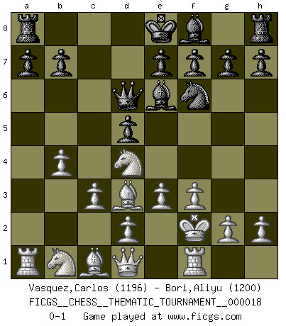 Last move : 0-1 2007 March 21 1:37:17 [Event "FICGS__CHESS__THEMATIC_TOURNAMENT__000018"] [Site "FICGS"] [Date "2006.11.27"] [Round "1"] [White "Vasquez,Carlos"] [Black "Bori,Aliyu"] [Result "0-1"] [WhiteElo "1196"] [BlackElo "1200"] 1.f3 d5 2.Kf2 Be6 3.e3 Nc6 4.Bd3 Nb4 5.a3 c6 6.axb4 Nf6 7.c3 Bd7 8.Ne2 Qb6 9.Rf1 Be6 10.Nd4 c5 11.bxc5 Qxc5 12.b4 Qd6 0-1 Gedult's Opening Player Black won this chess game. Follow this game move after move (download)Chess teaches you to control the initial excitement you feel when you see something that looks good and it trains you to think objectively when you're in trouble. (Stanley Kubrick) Wie, soll nun auch die Opposition abgeschafft werden? Ja, es tut mir leid, Ihnen diesen Schmerz nicht ersparen zu können. (Aaron Nimzowitsch) Cuando me preguntan: -¿Cual es el secreto que te hace hacer mejores movidas que tus oponentes?, Yo respondo: Me da gusto que me pregunten eso, porque, como veran, hay una simple razón. Yo pienso mis propias movidas y dejo a mi oponente que el piense las suyas. (Alexander Alekhine) L'action d'une oeuvre littéraire se déroule sur un champ de bataille. Les masques et les types du drame moderne correspondent aux pièces du jeu d'échecs. L'intrigue correspond aux coups et aux gambits, c'est à dire aux techniques du jeu telles qu'utilisées et interprétées par les joueurs. Les tactiques et les péripéties [mouvements] correspondent aux coups exécutés par l'adversaire. (Viktor Shklovsky) Creativity is inventing, experimenting, growing, taking risks, breaking rules, making mistakes, and having fun. (Mary Lou Cook)