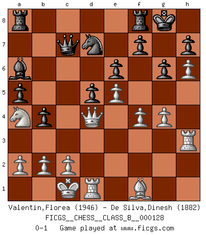 Last move : 0-1 2011 June 23 20:4:15 [Event "FICGS__CHESS__CLASS_B__000128"] [Site "FICGS"] [Date "2010.10.25"] [Round "1"] [White "Valentin,Florea"] [Black "De Silva,Dinesh"] [Result "0-1"] [WhiteElo "1946"] [BlackElo "1882"] 1.e4 e6 2.d4 d5 3.Nc3 Nf6 4.e5 Nfd7 5.f4 c5 6.Nf3 Nc6 7.Be3 cxd4 8.Nxd4 Bc5 9.Qd2 O-O 10.O-O-O a6 11.h4 Nxd4 12.Bxd4 b5 13.Rh3 b4 14.Na4 Bxd4 15.Qxd4 a5 16.h5 Qc7 17.h6 g6 18.g4 Ba6 0-1 This chess game has been lost on time (started : 2010.10.25 23:10:30) French : Steinitz, Boleslavsky variation Kingside Castling by player Black (move 9) Queenside Castling by player White (move 10) Player Black won this chess game. Follow this game move after move (download)Pawns: they are the soul of this game, they alone form the attack and defense. (Philidor) Schachspieler können ausgezeichnet Varianten am Schachbrett berechnen, aber nicht im realen Leben. Zu stark ist der Individualismus im Schach ausgeprägt, und für viele ist ein kleiner momentaner persönlicher Vorteil wichtiger als ein weit größerer Vorteil von morgen. (Anatoly Karpov) No es una movida, aún la mejor movida que tu debas buscar, sino un plan comprensible. (Eugene Znosko-Borovsky) Donnez-moi un Cavalier en 6e et je gagnerais toutes mes parties. (Steinitz) History is a gallery of pictures in which there are few originals and many copies. (Alexis de Tocqueville)