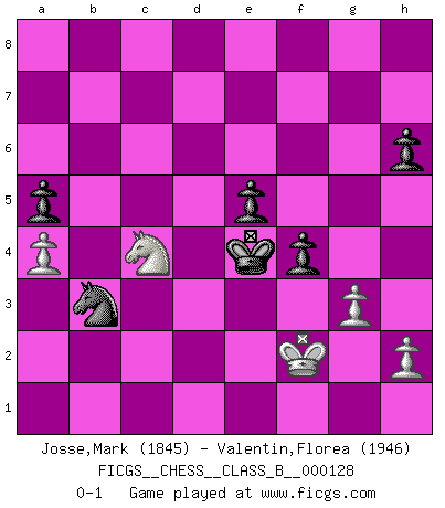 Last move : 0-1 2011 April 22 4:6:36 [Event "FICGS__CHESS__CLASS_B__000128"] [Site "FICGS"] [Date "2010.10.25"] [Round "1"] [White "Josse,Mark"] [Black "Valentin,Florea"] [Result "0-1"] [WhiteElo "1845"] [BlackElo "1946"] 1.d4 Nf6 2.c4 e6 3.Nf3 b6 4.g3 Ba6 5.Qc2 Bb7 6.Bg2 Bb4+ 7.Bd2 Bxd2+ 8.Qxd2 O-O 9.Nc3 d6 10.O-O Nbd7 11.Qc2 c5 12.Rad1 Qe7 13.e4 a6 14.Rfe1 cxd4 15.Nxd4 Rac8 16.b3 Rfd8 17.f4 Nf8 18.Qd2 Qc7 19.f5 b5 20.fxe6 fxe6 21.Rc1 bxc4 22.bxc4 Qa5 23.Rb1 Ba8 24.Bf1 Qc5 25.Na4 Qa7 26.Nb6 e5 27.Nf5 Rb8 28.c5 dxc5 29.Nd5 Kh8 30.Rxb8 Qxb8 31.Qc3 Nxe4 32.Rxe4 Rxd5 33.Re1 Ne6 34.Bg2 Qd8 35.Nh4 Nd4 36.Be4 Bc6 37.Nf3 h6 38.Nh4 Rd6 39.Bxc6 Nxc6 40.Qxc5 Rf6 41.a4 a5 42.Rf1 Qd4+ 43.Qxd4 Nxd4 44.Rxf6 gxf6 45.Kf2 Kg7 46.Ke3 f5 47.Ng2 Kf6 48.Kf2 Ke6 49.Ne3 Nb3 50.Nc4 Kd5 51.Ne3+ Ke4 52.Nc4 f4 0-1 Queen's Indian : Nimzovich variation (exaggerated Fianchetto) Kingside Castling by player Black (move 8) Kingside Castling by player White (move 10) Player Black won this chess game. Follow this game move after move (download)When you play Bobby, it is not a question if you win or lose. It is a question if you survive. (Boris Spassky) Wenn Capablanka heute auf der Schachbühne erscheinen würde, hätte er ein halbes Jahr gebraucht um sich die Schachtheorie anzueignen. Und dann hätte er alles und jeden besiegt. (Mikhail Moiseyevich Botvinik) Hay dos clases de hombres: aquellos que se conforman en dejarse llevar por las circunstancias y que juegan barajas y aquellos decididos a controlar las circunstancias y que juegan al Ajedrez. (Mortimer Collins) Je ne crois pas en la psychologie, je crois aux bons coups. (Robert Fischer) I don't know, I don't care, and it doesn't make any difference. (Albert Einstein)