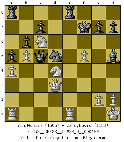 Last move : 0-1 2011 April 15 3:46:42 [Event "FICGS__CHESS__CLASS_D__000159"] [Site "FICGS"] [Date "2010.10.26"] [Round "1"] [White "Yin,Wenlin"] [Black "Ward,David"] [Result "0-1"] [WhiteElo "1506"] [BlackElo "1553"] 1.e4 e5 2.Nf3 Nc6 3.d4 exd4 4.Bc4 Bc5 5.c3 d3 6.b4 Bb6 7.a4 a5 8.b5 Nce7 9.Qb3 d5 10.exd5 Qd6 11.O-O Nf6 12.Ba3 Bc5 13.Bxc5 Qxc5 14.d6 Qxd6 15.Bxf7+ Kf8 16.Nbd2 Bg4 17.Nd4 Ned5 18.Bxd5 Qxd5 19.Qa3+ Kf7 20.f3 Bh5 21.Rfe1 Rhe8 22.N2b3 b6 23.Nc6 Bg6 24.Nbd4 Ng8 25.Qb2 Qc5 26.Qd2 Nf6 27.f4 Ne4 28.Qxd3 Nxc3 29.f5 Bh5 30.Kh1 Nd5 0-1 Scotch gambit Kingside Castling by player White (move 11) Player Black won this chess game. Follow this game move after move (download)Chess is really ninety nine percent calculation. (Soltis) Das typische an einem Großmeister ist, daß er eine gewonnene Position schnell und schmerzlos gewinnt. (Irving Chernev) No es una movida, aún la mejor movida que tu debas buscar, sino un plan comprensible. (Eugene Znosko-Borovsky) Il s'avisa de me proposer d'apprendre les échecs qu'il jouait un peu... me voilà forcené des échecs. J'achète un échiquier, je m'enferme dans ma chambre, j'y passe des jours et des nuits à vouloir apprendre par cur toutes les parties. (Jean-Jacques Rousseau, Confessions) The meaning of life is that it is to be lived, and it is not to be traded and conceptualized and squeezed into a pattern of systems. (Bruce Lee)
