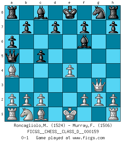 Last move : 0-1 2010 December 24 22:40:33 [Event "FICGS__CHESS__CLASS_D__000159"] [Site "FICGS"] [Date "2010.10.26"] [Round "1"] [White "Roncagliolo,Marco"] [Black "Murray,Findlay"] [Result "0-1"] [WhiteElo "1524"] [BlackElo "1506"] 1.e4 e5 2.Nf3 Nc6 3.Bb5 a6 4.Ba4 Be7 5.d4 exd4 6.Nxd4 Nxd4 7.Qxd4 c5 8.Qxg7 Bf6 9.Qg3 Qa5+ 0-1 This chess game has been lost on time (started : 2010.10.26 2:44:55) Ruy Lopez Player Black won this chess game. Follow this game move after move (download)In a gambit you give up a Pawn for the sake of getting a lost game. (Samuel Standige Boden) Ich trinke, ich rauche, ich spiele, ich liebe Frauen aber Fernschach ist ein Laster, das ich nicht habe. (Mikhail Nekhemyevich Tal) ¿Quién es tu oponente esta tarde? Esta tarde mi oponente son las piezas negras. (Akiba Rubinstein) Les échecs c'est le défi de l'alpiniste, toujours plus haut, prêt à tout pour monter à l'assaut du Roi ennemi. Les échecs, c'est de la musique en mouvement, un ballet majestueux pour les yeux. C'est de la poésie composée par les fantômes du passé qui au même titre que Rimbaud ou Verlaine méritent notre admiration. Les échecs, c'est de la peinture ou le moindre mouvement modifie le tableau pour en faire un Picasso ou un Van Gogh. Les échecs, c'est tout et rien, c'est la vie et la mort. Jjulie33 sur le forum de France-Echecs. Optimism is a variety of information deficit. Sometimes especially true for correspondence chess games. (Michael Aigner)