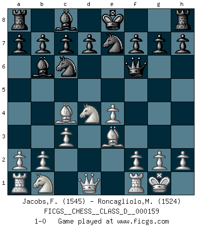 Last move : 1-0 2010 December 7 22:24:48 [Event "FICGS__CHESS__CLASS_D__000159"] [Site "FICGS"] [Date "2010.10.26"] [Round "1"] [White "Jacobs,Francois"] [Black "Roncagliolo,Marco"] [Result "1-0"] [WhiteElo "1545"] [BlackElo "1524"] 1.e4 e5 2.Nf3 Nc6 3.d4 exd4 4.Nxd4 Bc5 5.Be3 Qf6 6.c3 Nge7 7.Bc4 Bb6 8.O-O 1-0 This chess game has been lost on time (started : 2010.10.26 2:44:55) Scotch game Kingside Castling by player White (move 8) Player White won this chess game. Follow this game move after move (download)When I have White, I win because I am white; When I have Black, I win because I am Bogolyubov. (Bogolyubov) Die Fehler sind da, Sie warten nur darauf gemacht zu werden. (Savielly Grigorievitsch Tartakower) El Ajedrez es parte de la cultura, y si una cultura esta en decadencia, entonces también el Ajedrez declinará. (Mikhail Botvinnik) Un journaliste : 'Vous préférez avoir une dame de plus sur l'échiquier ou au lit ?' Boris Spassky : 'Ca dépend de la position.' Inventor: A person who makes an ingenious arrangement of wheels, levers and springs, and believes it civilization. (Ambrose Bierce, The Devil's Dictionary)
