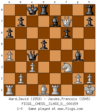 Last move : 1-0 2011 January 20 12:2:53 [Event "FICGS__CHESS__CLASS_D__000159"] [Site "FICGS"] [Date "2010.10.26"] [Round "1"] [White "Ward,David"] [Black "Jacobs,Francois"] [Result "1-0"] [WhiteElo "1553"] [BlackElo "1545"] 1.e4 c5 2.Nf3 e6 3.d4 cxd4 4.Nxd4 Nf6 5.Nc3 Nc6 6.Bg5 d6 7.Bc4 Be7 8.O-O Bd7 9.Ndb5 Qb8 10.Bxf6 gxf6 11.a4 a6 12.Na3 Qc7 13.Qh5 Ne5 14.Bb3 O-O-O 15.f4 Ng6 16.Nc4 d5 17.exd5 Bc5+ 18.Kh1 Nxf4 19.Qh4 Nxd5 20.Nxd5 exd5 21.Nd2 Qa5 22.c3 Be7 23.Qh5 Be6 24.Bd1 Qc7 25.Nf3 Qc4 26.Nd2 Qc7 27.Nf3 Qc4 28.Re1 Bg4 29.Qxf7 1-0 Sicilian : Anderssen variation Kingside Castling by player White (move 8) Queenside Castling by player Black (move 14) Player White won this chess game. Follow this game move after move (download)When in doubt... play Chess ! (Tevis) Bogoljubow: Matt in vier Zügen! Tartakower: Ich verbitte mir jede Belästigung! (Savielly Grigorievitsch Tartakower) El Ajedrez, como cualquier otra actividad creativa, puede existir solo a través de méritos combinados de aquellos que tienen talento creativo y de aquellos que tienen la habilidad de organizar un trabajo creativo. (Mikhail Botvinnik) Je fais ceci parce que dans cinquante coups j'obtiendrai cela; je m'appelle Mikhail Moisevitch Botvinnik. (Botvinnik) Now the reason the enlightened prince and the wise general conquer the enemy whenever they move and their achievements surpass those of ordinary men is foreknowledge. (Sun Tzu)