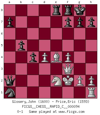 Last move : 0-1 2010 October 28 12:48:36 [Event "FICGS__CHESS__RAPID_C__000094"] [Site "FICGS"] [Date "2010.10.26"] [Round "1"] [White "Glosery,John"] [Black "Price,Eric"] [Result "0-1"] [WhiteElo "1600"] [BlackElo "1593"] 1.e4 e5 2.f4 d5 3.exd5 e4 4.Nc3 Nf6 5.Bc4 Bg4 6.Nge2 Bc5 7.d4 exd3 8.cxd3 O-O 9.d4 Bxe2 10.Nxe2 Bb4+ 11.Bd2 Nxd5 12.Bxb4 Nxb4 13.Qb3 c5 14.O-O-O Qa5 15.Kb1 b5 16.Bd5 c4 17.Qf3 Qxa2+ 18.Kc1 Qa1+ 19.Kd2 Qxb2+ 20.Ke1 N8c6 21.Bxc6 Rab8 22.Be4 Rbe8 23.Rb1 Nc2+ 24.Kf2 Qa2 25.Ra1 Nxa1 0-1 KGD : Falkbeer, 3...e4 Kingside Castling by player Black (move 8) Queenside Castling by player White (move 14) Player Black won this chess game. Follow this game move after move (download)The only thing Chess players have in common is Chess. (Lodewijk Prins) Garry Kasparov war erst in der Großmeister-Organisation GMA, dann in der Profischach-Vereinigung PCA, zum Schluss kehrte er wieder in den Schoß der FIDE zurück. Aber gut, manche Leute sind flexibel (Viswanathan Anand) Los problemas de Ajedrez exigen del compositor las mismas virtudes que caracterizan todo el arte de valor: originalidad, invención, concisión, armonía, complejidad e insinceridad explendida. (Vladimir Nabokov) Les Echecs mettent en conflit, non pas deux intelligences, mais deux volontés. (Lasker) Memory is a crazy woman that hoards colored rags and throws away food. (Austin O'Malley)