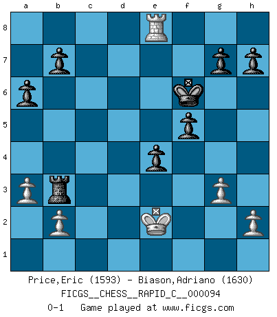Last move : 0-1 2010 December 20 1:8:39 [Event "FICGS__CHESS__RAPID_C__000094"] [Site "FICGS"] [Date "2010.10.26"] [Round "1"] [White "Price,Eric"] [Black "Biason,Adriano"] [Result "0-1"] [WhiteElo "1593"] [BlackElo "1630"] 1.e4 c5 2.Nf3 d6 3.d4 cxd4 4.Nxd4 Nf6 5.Nc3 a6 6.Bg5 e6 7.Be2 Be7 8.Bf3 Nxe4 9.Bxe7 Nxc3 10.Bxd8 Nxd1 11.Rxd1 Kxd8 12.c4 e5 13.Nc2 Kc7 14.Ne3 Be6 15.O-O Nc6 16.Nd5+ Bxd5 17.Bxd5 f6 18.f4 Rae8 19.fxe5 Rxe5 20.Rde1 Nb4 21.Rxe5 dxe5 22.a3 Nxd5 23.cxd5 Rc8 24.Rd1 Kd6 25.Rd2 Rc5 26.Kf1 f5 27.Ke2 Rxd5 28.Rc2 e4 29.g3 Rd3 30.Rc8 Rb3 31.Rd8+ Ke5 32.Re8+ Kf6 0-1 Sicilian : Najdorf, 6...e6 Kingside Castling by player White (move 15) Player Black won this chess game. Follow this game move after move (download)A man that will take back a move at Chess will pick a pocket. (Richard Fenton) Als ich elf wurde, wurde ich einfach gut. (Robert James Fischer) Ciertamente el estado mental actual de Bobby Fischer es una tragedia. Uno de los mas grandes jugadores de Ajedrez del mundo -el orgullo y pena del Ajedrez Americano. (Frank Brady) Aux échecs, l'amour-propre est satisfait quand on remporte la victoire, mais il n'y a pas de honte à être battu. (Benjamin Franklin) Without enthusiasm, virtue functions not at all, and vice only poorly. (Mignon McLaughlin, The Neurotic's Notebook, 1960)