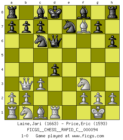 Last move : 1-0 2010 November 26 9:57:30 [Event "FICGS__CHESS__RAPID_C__000094"] [Site "FICGS"] [Date "2010.10.26"] [Round "1"] [White "Laine,Jari"] [Black "Price,Eric"] [Result "1-0"] [WhiteElo "1663"] [BlackElo "1593"] 1.e4 e5 2.Nf3 Nc6 3.c3 Nf6 4.d4 exd4 5.e5 Nd5 6.Qb3 Nde7 7.Bc4 d5 8.exd6 Qxd6 9.Bxf7+ Kd8 10.O-O h6 11.Rd1 1-0 Ponziani : Jaenisch counter-attack Kingside Castling by player White (move 10) Player White won this chess game. Follow this game move after move (download)Excellence at Chess is one mark of a scheming mind. (Sir Arthur Conan Doyle) Es gibt Leute, die glauben, alles wäre vernünftig, was man mit einem ernsthaften Gesicht tut. (Georg Christoph Lichtenberg) ¿Quién es tu oponente esta tarde? Esta tarde mi oponente son las piezas negras. (Akiba Rubinstein) L'attaque fait le spectacle, la défense gagne les matchs. (Dicton footballistique) A specialist learns more and more about less and less until he knows everything about nothing. (Nicholas Murray Butler)