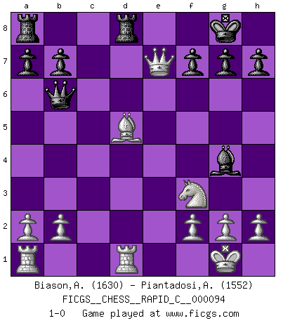 Last move : 1-0 2010 November 22 23:5:21 [Event "FICGS__CHESS__RAPID_C__000094"] [Site "FICGS"] [Date "2010.10.26"] [Round "1"] [White "Biason,Adriano"] [Black "Piantadosi,Angelo"] [Result "1-0"] [WhiteElo "1630"] [BlackElo "1552"] 1.d4 d5 2.c4 dxc4 3.Nf3 Nf6 4.e3 c5 5.Bxc4 e6 6.O-O Nc6 7.Qe2 cxd4 8.Rd1 Qb6 9.exd4 Be7 10.Bg5 O-O 11.Nc3 Rd8 12.d5 exd5 13.Nxd5 Nxd5 14.Bxd5 Bg4 15.Bxe7 Nxe7 16.Qxe7 1-0 QGA, 4.e3 Kingside Castling by player White (move 6) Kingside Castling by player Black (move 10) Player White won this chess game. Follow this game move after move (download)Suddenly it was obvious to me in my analysis I had missed what Fischer had found with the greatest of ease at the board. (Mikhail Botvinnik) Intelligenz läßt sich nicht am Weg, sondern nur am Ergebnis feststellen. (Garry Kasparov) Las piezas de Ajedrez son los bloques del alfabeto que moldean los pensamientos; y esos pensamientos, aunque hagan un diseño visual en el tablero, expresan abstractamente su belleza como un poema. (Marcel Duchamp) La tactique est l'élément le plus important du milieu de jeu. (Siegbert Tarrasch) Over-the-board chess is the favorite of mortals, correspondence chess is the favorite of the gods. (Eduard Dyckhoff)