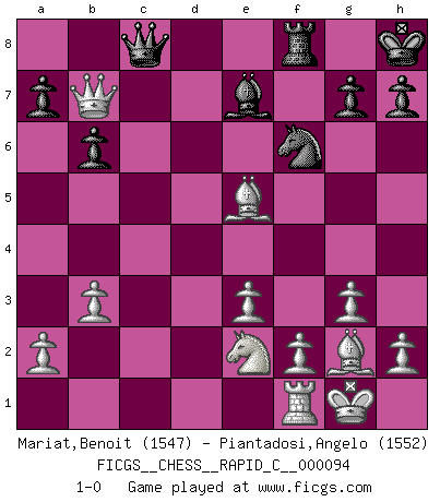 Last move : 1-0 2010 November 20 23:51:28 [Event "FICGS__CHESS__RAPID_C__000094"] [Site "FICGS"] [Date "2010.10.26"] [Round "1"] [White "Mariat,Benoit"] [Black "Piantadosi,Angelo"] [Result "1-0"] [WhiteElo "1547"] [BlackElo "1552"] 1.c4 e5 2.Nc3 Nf6 3.g3 d6 4.Bg2 c6 5.e3 Be6 6.b3 Be7 7.Nge2 O-O 8.O-O Nbd7 9.Bb2 d5 10.cxd5 cxd5 11.d4 e4 12.Nf4 b6 13.Nxe6 fxe6 14.Rc1 Rc8 15.Ne2 e5 16.dxe5 Nxe5 17.Bxe5 Ng4 18.Rxc8 Qxc8 19.Qxd5+ Kh8 20.Qxe4 Nf6 21.Qb7 1-0 English : Carls' Bremen system Kingside Castling by player Black (move 7) Kingside Castling by player White (move 8) Player White won this chess game. Follow this game move after move (download)Whoever sees no other aim in the game than that of giving checkmate to one's opponent will never become a good Chess player. (Euwe) Darum geht es im Schach. Einen Tag gibst du deinem Gegner eine Lektion, am nächsten Tag gibt er dir eine. (Robert James Fischer) Los asuntos humanos son como una partida de Ajedrez: solo aquellos que no lo toman seriamente, pueden ser llamados buenos jugadores. (Hung Tzu Ch'eng) Il s'avisa de me proposer d'apprendre les échecs qu'il jouait un peu... me voilà forcené des échecs. J'achète un échiquier, je m'enferme dans ma chambre, j'y passe des jours et des nuits à vouloir apprendre par cur toutes les parties. (Jean-Jacques Rousseau, Confessions) Experiences are the keys to life. (Daniel Parmet)