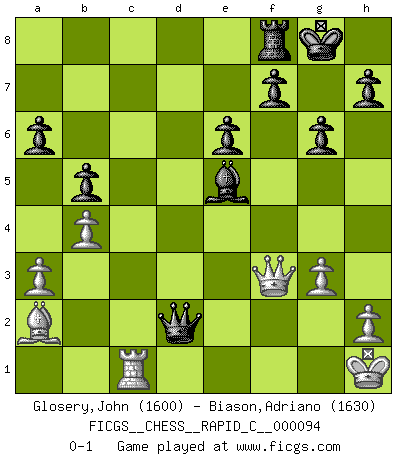 Last move : 0-1 2010 November 28 16:24:40 [Event "FICGS__CHESS__RAPID_C__000094"] [Site "FICGS"] [Date "2010.10.26"] [Round "1"] [White "Glosery,John"] [Black "Biason,Adriano"] [Result "0-1"] [WhiteElo "1600"] [BlackElo "1630"] 1.e4 c5 2.Nc3 Nc6 3.f4 g6 4.Bb5 Nd4 5.Bc4 d6 6.Nf3 Bg4 7.O-O Bxf3 8.Rxf3 Nxf3+ 9.Qxf3 a6 10.a3 Bg7 11.Nd5 e6 12.Ne3 Ne7 13.Rb1 b5 14.Ba2 Nc6 15.c3 Rb8 16.b4 O-O 17.e5 Rc8 18.Ng4 cxb4 19.cxb4 dxe5 20.fxe5 Qd4+ 21.Kh1 Nxe5 22.Nxe5 Bxe5 23.g3 Rxc1+ 24.Rxc1 Qxd2 0-1 Sicilian : Grand Prix attack Kingside Castling by player White (move 7) Kingside Castling by player Black (move 16) Player Black won this chess game. Follow this game move after move (download)Nonsense was the last thing Fischer was interested in, as far as Chess was concerned. (Elie Agur) Dein Körper muss in Topform sein. Dein Schach verfällt, wenn dein Körper verfällt. Der Körper kann nicht vom Geist getrennt werden. (Robert James Fischer) Tu no necesitas jugar muy bien, únicamente ayudar a tu oponenet a que juegue muy mal. (Genrikh Chepukaitis) C'est la seule position que je connaisse où les deux camps sont mals. Propos prêtés à V. Anand. A good teacher is like a candle - it consumes itself to light the way for others. (Author unknown)