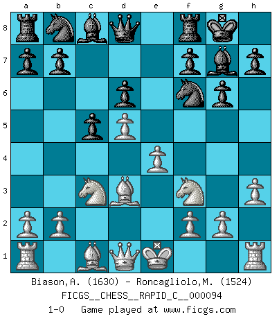 Last move : 1-0 2010 December 13 10:29:9 [Event "FICGS__CHESS__RAPID_C__000094"] [Site "FICGS"] [Date "2010.10.26"] [Round "1"] [White "Biason,Adriano"] [Black "Roncagliolo,Marco"] [Result "1-0"] [WhiteElo "1630"] [BlackElo "1524"] 1.d4 Nf6 2.c4 e6 3.Nf3 c5 4.d5 exd5 5.cxd5 d6 6.Nc3 g6 7.e4 Bg7 8.h3 O-O 9.Bd3 1-0 This chess game has been lost on time (started : 2010.10.26 16:48:41) Queen's pawn game Kingside Castling by player Black (move 8) Player White won this chess game. Follow this game move after move (download)Nowadays, when you're not a grandmaster at 14, you can forget about it. (Anand Viswanathan) Ich erzeugte keinen Neid, da mich die Schachspieler als Musiker und die Musiker als Schachspieler betrachteten. (Mark Taimanov) En la perfecta combinación de Ajedrez como en una historia corta de primera clase, toda la trama y contra trama deberá conducir hacia un final sorprendente, el interes no es mitigado hasta el último momento. (Yates and Winter) Même un GMI sait rarement calculer sur plus de cinq coups une attaque à sacrifices. (Rudolf Spielmann) Knowledge rests not upon truth alone, but upon error also. (Carl G. Jung)