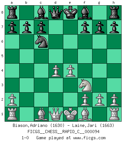 Last move : 1-0 2010 December 11 12:30:28 [Event "FICGS__CHESS__RAPID_C__000094"] [Site "FICGS"] [Date "2010.10.26"] [Round "1"] [White "Biason,Adriano"] [Black "Laine,Jari"] [Result "1-0"] [WhiteElo "1630"] [BlackElo "1663"] 1.d4 d5 2.c4 Nc6 3.Nc3 Nf6 4.cxd5 Nxd5 5.e4 Nxc3 6.bxc3 e5 7.Nf3 exd4 8.cxd4 1-0 QGD : Chigorin defense Player White won this chess game. Follow this game move after move (download)When you don't know what to do, wait for your opponent to get an idea - it's sure to be wrong. (Tarrasch) Um dein Spiel zu verbessern musst du zuallererst das Endspiel studieren, denn diese kann unabhängig studiert werden. Die Eröffnung und das Mittelspiel müssen immer in Bezug gesetzt werden zum Endspiel. (José Raúl Capablanca) No todos los artistas son jugadores de Ajedrez, pero todos los jugadores de Ajedrez son artistas. (Marcel Duchamp) Si rien de grave n'est détecté lors de l'analyse d'une position, on joue alors le coup. Seconde règle de Blumenfeld. We cannot be sure of having something to live for unless we are willing to die for it. (Ernesto Che Guevara)