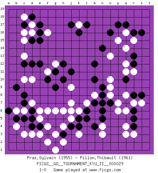 Last move : 1-0 2010 November 4 19:18:16 [Event "FICGS__GO__TOURNAMENT_KYU_II__000029"] [Site "FICGS"] [Date "2010.10.26"] [Round "1"] [Black "Praz,Sylvain"] [White "Pillon,Thibault"] [Result "1-0"] [Rating 1 "1955"] [Rating 2 "1961"] 1.r16 d17 2.d4 q4 3.p17 c6 4.c8 f4 5.d6 d7 6.c7 d3 7.c5 c3 8.d15 f16 9.q10 c13 10.r6 q6 11.q7 p6 12.r4 r3 13.r5 q3 14.k16 p15 15.o16 r15 16.s16 q16 17.q17 q14 18.h3 k3 19.f3 e3 20.g4 f2 21.g2 g3 22.r13 q12 23.r12 h2 24.f3 b6 25.b5 g3 26.c17 g1 27.d18 e6 28.d5 c16 29.e17 d16 30.e16 c15 31.e15 c18 32.n14 o13 33.m12 o10 34.m10 o8 35.e12 k17 36.l17 m8 37.j17 j9 38.j11 c10 39.b9 g12 40.f10 g10 41.h10 f11 42.g9 h11 43.g11 r7 44.r8 g10 45.n9 o9 46.g11 s7 47.s8 g10 48.n8 q8 49.g11 q11 50.h12 r11 51.n6 n4 52.o7 p7 53.k5 m5 54.l6 m6 55.m7 l7 56.n7 k6 57.l5 j7 58.h5 j5 59.j4 j6 60.k4 h6 61.f5 g6 62.g5 e5 63.e4 f6 64.f3 b4 65.a6 f4 66.m4 h4 67.n5 n3 68.c12 d10 69.d12 1-0 Here are the names of the openings (joseki) played in the four corners : Corner d4 : d4 c6 Hoshi (Hwajeom, Seongjeom, Xingwei`) 4-4 Point. The star or hoshi (4-4) point, emphasizing influence at the potential expense of territory. Ikken Kakari (Hankan Keolch'im, Yi Gua`jiao~, 1-Space Low Approach). White 2 is the standard approach move to the 4-4. Corner d16 : d17 d15 Komoku (Somok, Xiao~mu`) 3-4 Point. The komoku (3-4) point is the traditional corner enclosure move.. Ikken Takagakari (Hankan Nop'dakeolch'im, Yi Gaogua`jiao~, 1-Space High Approach). The 5-4 approach move has become more popular in modern times, as modern Go emphasizes speed and influence. Corner q4 : q4 r6 Hoshi (Hwajeom, Seongjeom, Xingwei`) 4-4 Point. The star or hoshi (4-4) point, emphasizing influence at the potential expense of territory. Ikken Kakari (Hankan Keolch'im, Yi Gua`jiao~, 1-Space Low Approach). Black 2 is the standard approach move to the 4-4. Player Black won this Go (weiqi, baduk) game. Follow this game move after move (download)Don't get surrounded ! Ever ! (Anonymous) See no evil, hear no evil, speak no evil. (The 3 monkeys)