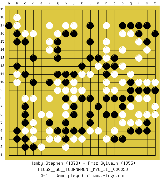 Last move : 0-1 2011 April 11 8:0:24 [Event "FICGS__GO__TOURNAMENT_KYU_II__000029"] [Site "FICGS"] [Date "2010.10.26"] [Round "1"] [Black "Hamby,Stephen"] [White "Praz,Sylvain"] [Result "0-1"] [Rating 1 "1373"] [Rating 2 "1955"] 1.r16 d16 2.q4 d3 3.p17 r10 4.r7 r13 5.c5 d8 6.f5 g3 7.d10 f8 8.c7 c8 9.b3 c4 10.b4 d5 11.c3 d4 12.c6 e6 13.d13 f17 14.c15 c16 15.b16 b17 16.b15 o4 17.o3 n3 18.p3 m4 19.l17 j17 20.h4 j3 21.j4 k3 22.h8 h6 23.j6 h7 24.j7 f6 25.h5 j8 26.k8 j9 27.l6 k9 28.l8 n17 29.l15 n15 30.j16 h17 31.h16 g16 32.g15 f15 33.g14 n13 34.l13 s16 35.s15 r15 36.s17 q16 37.r17 s14 38.t16 r5 39.r4 q5 40.p7 p5 41.s5 s6 42.s4 r6 43.s7 t6 44.n6 o7 45.o6 p6 46.p8 n7 47.m7 o9 48.o8 n9 49.n8 b10 50.c11 b11 51.b12 p16 52.n11 o11 53.o10 p10 54.o12 n10 55.n12 p12 56.o13 p14 57.m13 n14 58.d2 e2 59.c2 f4 60.j11 g10 61.g11 f14 62.g13 q7 63.q8 r8 64.r9 s8 65.s9 t7 66.q9 s10 67.t9 t10 68.q10 q11 69.h3 h2 70.h10 h9 71.f10 g9 72.a17 b18 73.q17 k11 74.k12 l11 75.g4 f3 76.k4 l4 77.l5 j10 78.h11 m12 0-1 Here are the names of the openings (joseki) played in the four corners : Corner d4 : d3 c5 Komoku (Somok, Xiao~mu`) 3-4 Point. The komoku (3-4) point is the traditional corner enclosure move.. Ikken Kakari (Hankan Keolch'im, Yi Gua`jiao~, 1-Space Low Pincer). The small knight move is the basic approach move to the 3-4 point stone. It has been continually used for over four centuries. There are limitless variations, with new moves constantly being discovered. Black 2 opens the door to a treaure store of joseki. Corner d16 : d16 d13 Hoshi (Hwajeom, Seongjeom, Xingwei`) 4-4 Point. The star or hoshi (4-4) point, emphasizing influence at the potential expense of territory. Niken Takagakari (Dukan Nop'dakeolch'im, E`r Gaojia, 2-Space High Approach). Black 2 is a light approach move. Rarely played in even games, Black 2 is typically employed in handicap games. White continues with 6-4 or 3-10. In Korean Sunjang Baduk White has a stone on 8-4. Player White won this Go (weiqi, baduk) game. Follow this game move after move (download)... {it is} something unearthly... if there are sentient beings on other planets, then they play go. (Emanuel Lasker, chess world champion) Creativity is allowing yourself to make mistakes. Art is knowing which ones to keep. (Scott Adams)