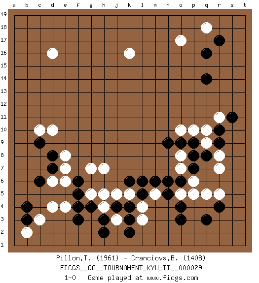 Last move : 1-0 2011 February 26 11:11:32 [Event "FICGS__GO__TOURNAMENT_KYU_II__000029"] [Site "FICGS"] [Date "2010.10.26"] [Round "1"] [Black "Pillon,Thibault"] [White "Cranciova,Bogdan"] [Result "1-0"] [Rating 1 "1961"] [Rating 2 "1408"] 1.q16 d4 2.q3 d16 3.r9 q5 4.o4 o17 5.q14 q18 6.r17 d10 7.f3 h4 8.f5 l4 9.h2 k16 10.c6 c3 11.j4 j3 12.h3 j5 13.k4 k5 14.k3 l3 15.k2 g5 16.g4 h5 17.c9 c10 18.b4 e4 19.f4 d6 20.d7 e6 21.b3 b2 22.f6 e7 23.d8 e8 24.l5 m5 25.l6 h7 26.k6 g7 27.o6 r7 28.r4 r5 29.p8 q9 30.q8 r8 31.r10 p10 32.m6 o5 33.n5 p5 34.o3 o7 35.p7 p6 36.n6 o8 37.p9 q10 38.o9 o10 39.n9 r11 40.s11 1-0 This go game has been lost on time (started : 2010.10.26 19:22:52) Here are the names of the openings (joseki) played in the four corners : Corner q16 : q16 o17 Hoshi (Hwajeom, Seongjeom, Xingwei`) 4-4 Point. The star or hoshi (4-4) point, emphasizing influence at the potential expense of territory. Ikken Kakari (Hankan Keolch'im, Yi Gua`jiao~, 1-Space Low Approach). White 2 is the standard approach move to the 4-4. Corner d4 : d4 f3 Hoshi (Hwajeom, Seongjeom, Xingwei`) 4-4 Point. The star or hoshi (4-4) point, emphasizing influence at the potential expense of territory. Ikken Kakari (Hankan Keolch'im, Yi Gua`jiao~, 1-Space Low Approach). Black 2 is the standard approach move to the 4-4. Player Black won this Go (weiqi, baduk) game. Follow this game move after move (download)If you cannot succeed, then die gloriously. (Chinese proverb) I don't know, I don't care, and it doesn't make any difference. (Albert Einstein)