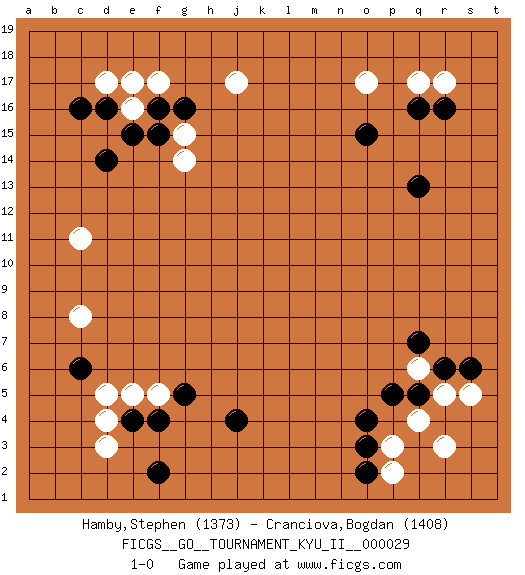 Last move : 1-0 2011 March 16 19:2:10 [Event "FICGS__GO__TOURNAMENT_KYU_II__000029 "] [Site "FICGS"] [Date "2010.10.26"] [Round "1"] [Black "Hamby,Stephen "] [White "Cranciova,Bogdan "] [Result "1-0"] [Rating 1 "1373"] [Rating 2 "1408"] 1.q16 d4 2.c16 q4 3.r6 e16 4.e15 d17 5.d16 e17 6.d14 j17 7.c6 c8 8.f4 e5 9.e4 d5 10.j4 o17 11.q13 c11 12.o3 r3 13.p5 s5 14.s6 p2 15.o2 p3 16.o4 q6 17.q5 r5 18.q7 f5 19.g5 d3 20.f2 r17 21.r16 q17 22.o15 g14 23.f15 g15 24.f16 f17 25.g16 1-0 Here are the names of the openings (joseki) played in the four corners : Corner q4 : q4 r6Hoshi (Hwajeom, Seongjeom, Xingwei`) 4-4 Point. The star or hoshi (4-4) point, emphasizing influence at the potential expense of territory.Ikken Kakari (Hankan Keolch'im, Yi Gua`jiao~, 1-Space Low Approach). Black 2 is the standard approach move to the 4-4. Corner d16 : c16 e16Komoku (Somok, Xiao~mu`) 3-4 Point. The komoku (3-4) point is the traditional corner enclosure move..Ikken Takagakari (Hankan Nop'dakeolch'im, Yi Gaogua`jiao~, 1-Space High Approach). The 5-4 approach move has become more popular in modern times, as modern Go emphasizes speed and influence. Corner d4 : d4 c6Hoshi (Hwajeom, Seongjeom, Xingwei`) 4-4 Point. The star or hoshi (4-4) point, emphasizing influence at the potential expense of territory.Ikken Kakari (Hankan Keolch'im, Yi Gua`jiao~, 1-Space Low Approach). Black 2 is the standard approach move to the 4-4. Corner q16 : q16 o17Hoshi (Hwajeom, Seongjeom, Xingwei`) 4-4 Point. The star or hoshi (4-4) point, emphasizing influence at the potential expense of territory.Ikken Kakari (Hankan Keolch'im, Yi Gua`jiao~, 1-Space Low Approach). White 2 is the standard approach move to the 4-4. Player Black won this Go (weiqi, baduk) game.Follow this game move after move (download ) If you lose by one point, take a rest. (Anonymous) A woman without a man is like a fish without a bicycle. (Gloria Steinem)
