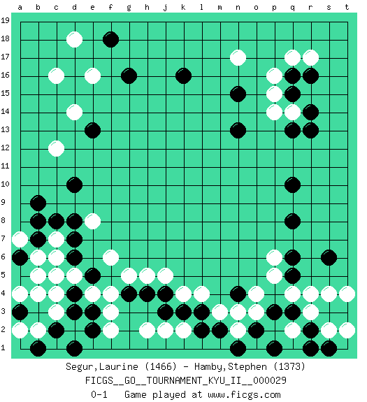 Last move : 0-1 2011 April 26 18:40:47 [Event "FICGS__GO__TOURNAMENT_KYU_II__000029"] [Site "FICGS"] [Date "2010.10.26"] [Round "1"] [Black "Segur,Laurine"] [White "Hamby,Stephen"] [Result "0-1"] [Rating 1 "1466"] [Rating 2 "1373"] 1.d4 q4 2.q16 c16 3.q10 k4 4.k16 e16 5.d10 c12 6.q6 p6 7.q5 p5 8.q8 f3 9.d7 r4 10.e2 f2 11.n15 q14 12.r13 r17 13.r16 q17 14.r14 p16 15.q15 p15 16.q13 p14 17.g16 n17 18.f18 d18 19.n13 f6 20.e13 d14 21.n4 o4 22.p3 o3 23.o2 n2 24.p1 n3 25.q3 r3 26.r2 s2 27.r1 q2 28.s3 s4 29.t3 t2 30.s6 c6 31.d6 c3 32.d3 c4 33.c2 b2 34.b1 c7 35.c8 a2 36.b7 b6 37.b9 a7 38.b8 b4 39.c5 b5 40.a3 a4 41.a6 d5 42.e5 e4 43.e3 f4 44.c5 c1 45.d1 d5 46.s1 t4 47.c5 e8 48.d8 d5 49.n1 c5 50.m2 m3 51.l2 k2 52.l3 l4 53.k3 j2 54.j3 h2 55.h4 h5 56.g4 g5 57.j4 j5 0-1 Here are the names of the openings (joseki) played in the four corners : Corner q4 : q4 q6 Hoshi (Hwajeom, Seongjeom, Xingwei`) 4-4 Point. The star or hoshi (4-4) point, emphasizing influence at the potential expense of territory. Ikken Takagakari (Hankan Nop'dakeolch'im, Yi Gaojia, 1-Space High Approach). White typically responds at 6-4 or 3-10. White 4-10 is played when White finds play on the right side advantageous. White 4-8 or 3-8 may be played when White has support at top. Corner d4 : d4 f3 Hoshi (Hwajeom, Seongjeom, Xingwei`) 4-4 Point. The star or hoshi (4-4) point, emphasizing influence at the potential expense of territory. Ikken Kakari (Hankan Keolch'im, Yi Gua`jiao~, 1-Space Low Approach). White 2 is the standard approach move to the 4-4. Player White won this Go (weiqi, baduk) game. Follow this game move after move (download)The second line is the line of defeat, the third line is the line of territory, and the fourth line is the line of influence. (Anonymous) No enterprise is more likely to succeed than one concealed from the enemy until it is ripe for execution. (Niccolo Machiavelli)