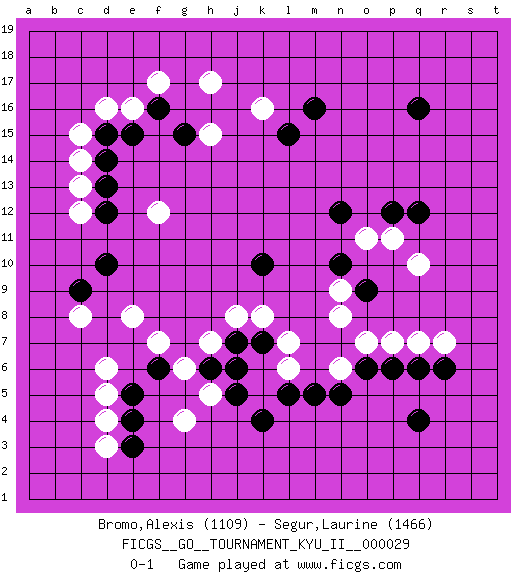 Last move : 0-1 2011 February 26 23:10:34 [Event "FICGS__GO__TOURNAMENT_KYU_II__000029"] [Site "FICGS"] [Date "2010.10.26"] [Round "1"] [Black "Bromo,Alexis"] [White "Segur,Laurine"] [Result "0-1"] [Rating 1 "1109"] [Rating 2 "1466"] 1.q16 d4 2.q4 d16 3.k10 k16 4.k4 q10 5.d10 c8 6.c9 c12 7.d12 c13 8.d13 c14 9.d14 g4 10.f6 d6 11.e5 d5 12.e4 d3 13.e3 e8 14.p12 q7 15.q6 p7 16.p6 n8 17.o9 n9 18.n10 o11 19.n12 p11 20.q12 r7 21.r6 n6 22.n5 l6 23.l5 k8 24.o6 o7 25.e15 f17 26.m16 h5 27.j5 h7 28.h6 g6 29.j6 f7 30.f16 h17 31.l15 h15 32.g15 e16 33.d15 c15 34.j7 j8 35.k7 l7 36.m5 f12 0-1 This go game has been lost on time (started : 2010.10.26 19:22:52) Here are the names of the openings (joseki) played in the four corners : Corner q4 : q4 q7 Hoshi (Hwajeom, Seongjeom, Xingwei`) 4-4 Point. The star or hoshi (4-4) point, emphasizing influence at the potential expense of territory. Niken Takagakari (Dukan Nop'dakeolch'im, E`r Gaojia, 2-Space High Approach). White 2 is a light approach move. Rarely played in even games, White 2 is typically employed in handicap games. Black continues with 6-4 or 3-10. In Korean Sunjang Baduk Black has a stone on 8-4. Player White won this Go (weiqi, baduk) game. Follow this game move after move (download)The intersection is rarely neutral. (Pierre Audouard) Convictions are more dangerous enemies of truth than lies. (Friedrich Nietzsche)