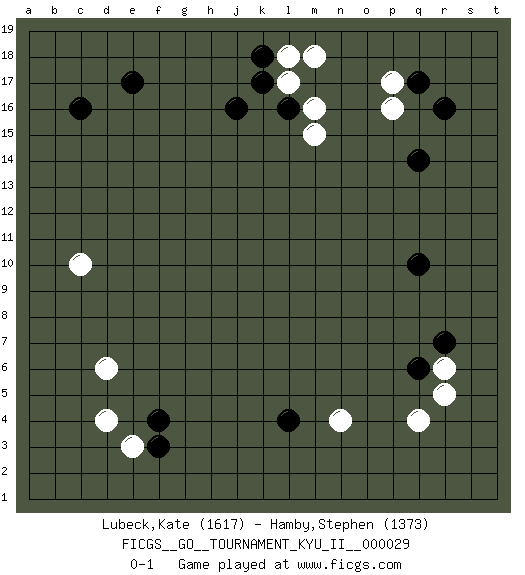 Last move : 0-1 2011 January 3 11:9:13 [Event "FICGS__GO__TOURNAMENT_KYU_II__000029 "] [Site "FICGS"] [Date "2010.10.26"] [Round "1"] [Black "Lubeck,Kate "] [White "Hamby,Stephen "] [Result "0-1"] [Rating 1 "1617"] [Rating 2 "1373"] 1.r16 d4 2.c16 q4 3.e17 c10 4.q10 p17 5.q17 p16 6.q14 m15 7.q6 r6 8.r7 r5 9.j16 l17 10.k17 l18 11.l16 m16 12.k18 m18 13.f3 e3 14.f4 d6 15.l4 n4 0-1 This go game has been lost on time (started : 2010.10.26 19:22:52) Here are the names of the openings (joseki) played in the four corners : Corner q16 : r16 p17Komoku (Somok, Xiao~mu`) 3-4 Point. The komoku (3-4) point is the traditional corner enclosure move..Ikken Kakari (Hankan Keolch'im, Yi Gua`jiao~, 1-Space Low Pincer). The small knight move is the basic approach move to the 3-4 point stone. It has been continually used for over four centuries. There are limitless variations, with new moves constantly being discovered. White 2 opens the door to a treaure store of joseki. Corner q4 : q4 q6Hoshi (Hwajeom, Seongjeom, Xingwei`) 4-4 Point. The star or hoshi (4-4) point, emphasizing influence at the potential expense of territory.Ikken Takagakari (Hankan Nop'dakeolch'im, Yi Gaojia, 1-Space High Approach). White typically responds at 6-4 or 3-10. White 4-10 is played when White finds play on the right side advantageous. White 4-8 or 3-8 may be played when White has support at top. Corner d4 : d4 f3Hoshi (Hwajeom, Seongjeom, Xingwei`) 4-4 Point. The star or hoshi (4-4) point, emphasizing influence at the potential expense of territory.Ikken Kakari (Hankan Keolch'im, Yi Gua`jiao~, 1-Space Low Approach). Black 2 is the standard approach move to the 4-4. Player White won this Go (weiqi, baduk) game.Follow this game move after move (download ) Attach to the strongest stone in a pincer. (Anonymous) Watch your thoughts; they become words. Watch your words; they become actions. Watch your actions; they become habits. Watch your habits; they become character. Watch your character; it becomes your destiny. (Frank Outlaw)