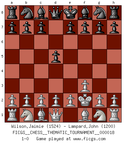 Last move : 1-0 2007 January 6 16:25:43 [Event "FICGS__CHESS__THEMATIC_TOURNAMENT__000018"] [Site "FICGS"] [Date "2006.11.27"] [Round "1"] [White "Wilson,Jaimie"] [Black "Lampard,John"] [Result "1-0"] [WhiteElo "1524"] [BlackElo "1200"] 1.f3 d5 2.Kf2 1-0 This chess game has been lost on time (started : 2006.11.27 15:50:24) Gedult's Opening Player White won this chess game. Follow this game move after move (download)Chess is a foolish expedient for making idle people believe they are doing something very clever when they are only wasting their time. (George Bernard Shaw) Versuche, dich von der Sklaverei der Eröffnungsvarianten zu befreien. Stattdessen soll man gewisse Typenpositionen erlernen, die man eingehend analysiert. (Aaron Nimzowitsch) Yo jugué Ajedrez con el y a veces le pude haber ganado solo que siempre devuelve su última jugada y juega la partida de manera diferente. (Mark Twain) Les réformistes prétendent que les progrès de la théorie conduiront à la disparition des échecs, et qu'il faut, pour leur rendre vie, en remanier les règles. En réalité, qu'exprime cette affirmation? Le mépris de l'intuition, de l'imagination et de tous les autres éléments qui font des échecs un art. (Alexander Alekhine) No, no, you're not thinking; you're just being logical. (Niels Bohr)