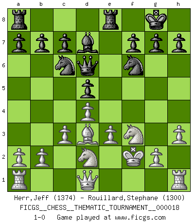 Last move : 1-0 2007 March 1 12:11:34 [Event "FICGS__CHESS__THEMATIC_TOURNAMENT__000018"] [Site "FICGS"] [Date "2006.11.27"] [Round "1"] [White "Herr,Jeff"] [Black "Rouillard,Stephane"] [Result "1-0"] [WhiteElo "1374"] [BlackElo "1300"] 1.f3 d5 2.Kf2 e5 3.d4 e4 4.Bf4 Bd6 5.Bg3 Nf6 6.Bxd6 Qxd6 7.c3 O-O 8.Nd2 Re8 9.e3 Bd7 10.h3 exf3 11.Ngxf3 Nc6 12.Bd3 1-0 This chess game has been lost on time (started : 2006.11.27 15:50:24) Gedult's Opening Kingside Castling by player Black (move 7) Player White won this chess game. Follow this game move after move (download)It is the aim of the modern school, not to treat every position according to one general law, but according to the principle inherent in the position. (Richard Reti) Wer sich die Fähigkeit anerziehen will im Schach selbstständig zu denken, der muß alles meiden, was leblos ist: ausgeklügelte Theorien, die sich auf sehr wenige Beispiele und eine Menge Hirngespinste stützen. (Emanuel Lasker) Los tropiezos estan todos ahí en el tablero, esperando que se cometan. (Savielly Tartakover) La solitude du joueur d'Echecs à l'approche du mat est semblable à celle du condamné. (Francis Szpiner) If you know the enemy and know yourself you need not fear the results of a hundred battles. (Sun Tzu)