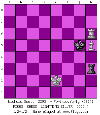 Last move : 1/2-1/2 2010 October 28 16:43:25 [Event "FICGS__CHESS__LIGHTNING_SILVER__000047"] [Site "FICGS"] [Date "2010.10.28"] [Round "1"] [White "Nichols,Scott"] [Black "Perikov,Yuriy"] [Result "1/2-1/2"] [WhiteElo "2293"] [BlackElo "1917"] 1.e4 c5 2.Nf3 d6 3.d4 cxd4 4.Nxd4 Nf6 5.Nc3 a6 6.Bg5 e6 7.f4 Nbd7 8.Qf3 Be7 9.O-O-O Qc7 10.g4 b5 11.Bxf6 Nxf6 12.g5 Nd7 13.f5 Nc5 14.f6 gxf6 15.gxf6 Bf8 16.Kb1 Rg8 17.b4 Na4 18.Nxa4 bxa4 19.a3 Rg6 20.h4 e5 21.h5 Rg4 22.Nf5 Rf4 23.Qd3 Bb7 24.Nxd6+ Qxd6 25.Qxd6 Bxd6 26.Rxd6 Rd8 27.Rxd8+ Kxd8 28.Bh3 Rxf6 29.Bf5 Rh6 30.Rh3 Kc7 31.Kb2 Bc6 32.c4 Bd7 33.Bxd7 Kxd7 34.Kc3 Rf6 35.Rd3+ Kc6 36.c5 Kb5 37.Rd8 Rf3+ 38.Kd2 Rxa3 39.Rb8+ Kc6 40.Rb6+ Kc7 41.Rxa6 Kb7 42.b5 Rb3 43.c6+ Kc7 44.Ra7+ Kb8 45.Rb7+ Kc8 46.Rxf7 h6 47.Rb7 a3 48.Kc2 a2 49.Ra7 Rxb5 50.Rxa2 Rc5+ 51.Kd3 Rxc6 52.Ra5 Kd7 53.Rxe5 Ra6 54.Ke3 Ra2 55.Kf3 Ra1 56.Kg4 Rh1 57.Kf4 Rf1+ 58.Ke3 Kd6 59.Rb5 Rg1 60.Kd4 Rd1+ 61.Kc4 Rh1 62.Kd3 Rd1+ 63.Ke2 Rh1 64.Rd5+ Ke6 65.Rf5 Rh2+ 66.Kf3 Rh1 67.Kf2 Rd1 68.Ra5 Rd3 69.Ke2 Rh3 70.Ra6+ Ke5 71.Rxh6 Kxe4 72.Kd2 Kf4 73.Ke2 Kg5 1/2-1/2 Sicilian : Najdorf, 7.f4 Queenside Castling by player White (move 9) 10 pieces endgame at move 49 : White KRPPP , Black KRPPP WHITE : King + 1 Rook 3 Pawns BLACK : King + 1 Rook 3 Pawns 9 pieces endgame at move 50 : White KRPPP , Black KRPP WHITE : King + 1 Rook 3 Pawns BLACK : King + 1 Rook 2 Pawns 8 pieces endgame at move 51 : White KRPP , Black KRPP WHITE : King + 1 Rook 2 Pawns BLACK : King + 1 Rook 2 Pawns 7 pieces endgame at move 53 : White KRPP , Black KRP WHITE : King + 1 Rook 2 Pawns BLACK : King + 1 Rook 1 Pawn 6 pieces endgame at move 71 : White KRPP , Black KR WHITE : King + 1 Rook 2 Pawns BLACK : King + 1 Rook 5 pieces endgame at move 71 : White KRP , Black KR WHITE : King + 1 Rook 1 Pawn BLACK : King + 1 Rook This chess game ended in a draw. Follow this game move after move (download)Chess demands total concentration. (Bobby Fischer) In der Schule lernt man nichts. Es ist nur Zeitverschwendung. (Robert James Fischer) Estaba muy claro de que el punto vulnerable del Gran Maestro Americano (Bobby Fischer) radicaba en las posiciones de doble filo, colgantes, irracionales, donde el siempre falló en encontrar un triunfo aún en una posición de clara victoria. (Efim Geller) La guerre est enfant de la passion, la passion est enfant du narcissisme et le narcissisme est l'enfant. (...) Une autre partie ? (Thibault de Vassal) The large trees attract high winds. (Chinese proverb)