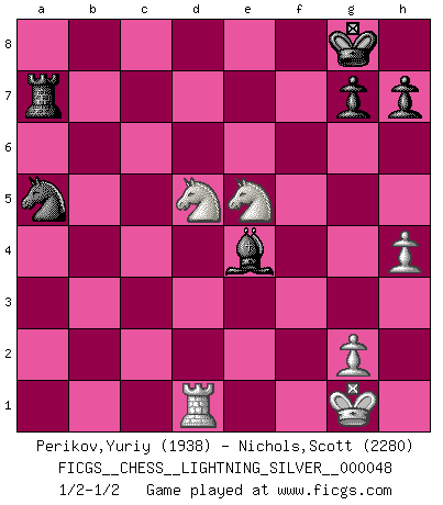 Last move : 1/2-1/2 2010 October 28 19:4:50 [Event "FICGS__CHESS__LIGHTNING_SILVER__000048"] [Site "FICGS"] [Date "2010.10.28"] [Round "1"] [White "Perikov,Yuriy"] [Black "Nichols,Scott"] [Result "1/2-1/2"] [WhiteElo "1938"] [BlackElo "2280"] 1.e4 e5 2.Nf3 Nc6 3.Bb5 Nf6 4.O-O Nxe4 5.d4 Be7 6.Qe2 Nd6 7.Bxc6 bxc6 8.dxe5 Nb7 9.c4 O-O 10.Nc3 f6 11.Re1 fxe5 12.Nxe5 Bf6 13.Bf4 Qe8 14.Qc2 d6 15.Ng4 Be7 16.Bg5 Bf5 17.Qd2 Bxg5 18.Qxg5 Qg6 19.Qxg6 Bxg6 20.b4 a5 21.b5 Nc5 22.Rad1 Rf7 23.Rd2 Nd3 24.Red1 Re8 25.bxc6 Nb4 26.Ne3 Nxc6 27.Rd5 R7f8 28.a4 Ne5 29.Rxa5 c6 30.Ra6 Nd3 31.Nf1 Rxf2 32.Rxc6 Rc2 33.Nd5 Nb2 34.Rd2 Rxc4 35.Rc7 Rxc7 36.Nxc7 Re7 37.Nd5 Rb7 38.a5 Nd3 39.Nfe3 Nc5 40.h4 Be4 41.Nc4 Nb3 42.Rd1 Ra7 43.Nc3 d5 44.Nxd5 Nxa5 45.Ne5 1/2-1/2 Ruy Lopez : Open Berlin defense, 5...Be7 Kingside Castling by player White (move 4) Kingside Castling by player Black (move 9) This chess game ended in a draw. Follow this game move after move (download)I am the best player in the world and I am here to prove it. (Bobby Fischer) Im Fernschach kannst du während dem Spiel rauchen. (John Christen Knudsen) Aquel que teme a un Peón de Reina aislado, debería de retirarse del Ajedrez. (Siegbert Tarrasch) La vie et les Echecs sont tous les deux une lutte constante. (Lasker) May the force be with you. (Han Solo in Star Wars ep.4)