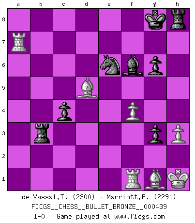 Last move : 1-0 2010 October 28 19:52:37 [Event "FICGS__CHESS__BULLET_BRONZE__000439"] [Site "FICGS"] [Date "2010.10.28"] [Round "1"] [White "de Vassal,Thibault"] [Black "Marriott,Peter"] [Result "1-0"] [WhiteElo "2300"] [BlackElo "2291"] 1.d4 d5 2.c4 e6 3.Nc3 Nf6 4.Nf3 c6 5.g3 dxc4 6.Bg2 Nbd7 7.O-O b5 8.e4 Bb7 9.e5 Nd5 10.Ng5 Be7 11.Qh5 g6 12.Qh6 Bf8 13.Qh3 Be7 14.Nce4 h5 15.a4 b4 16.a5 Kf8 17.f4 Kg7 18.Bd2 Nf8 19.g4 f6 20.exf6+ Nxf6 21.a6 Bc8 22.Nxf6 Bxf6 23.Bxb4 Bxd4+ 24.Kh1 Rb8 25.Qa3 c5 26.Bxc5 Bxb2 27.Qa5 Qxa5 28.Rxa5 hxg4 29.Bxa7 g3 30.h3 Rb3 31.Bg1 Bxa6 32.Rxa6 Bf6 33.Ra7+ Kg8 34.Nxe6 Nxe6 35.Bd5 1-0 QGD Semi-Slav Kingside Castling by player White (move 7) Player White won this chess game. Follow this game move after move (download)Personally, I rather look forward to a computer program winning the world Chess Championship. Humanity needs a lesson in humility. (Richard Dawkings) Ich habe Putins Aufstieg an die Macht beobachtet und seine Politik, die demokratischen Institutionen meines Landes zu zerstören. (Garry Kasparov) De eso se trata el Ajedrez. Un día le das una lección a tu oponente y al día siguiente el te da una a tí. (Bobby Fischer) Lorsque vous vous retrouvez devant une position atroce, ne tendez pas un ultime piège dérisoire avec l'intention d'abandonner si l'adversaire le déjoue ! Faites-vous plutôt un devoir de résister comme si votre vie en dépendait. Jouez le coup qui vous déplairait au centuple si vous étiez dans la peau de votre tortionnaire ! Convictions are more dangerous enemies of truth than lies. (Friedrich Nietzsche)