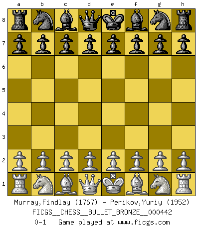 Last move : 0-1 2010 October 28 22:31:35 [Event "FICGS__CHESS__BULLET_BRONZE__000442"] [Site "FICGS"] [Date "2010.10.28"] [Round "1"] [White "Murray,Findlay"] [Black "Perikov,Yuriy"] [Result "0-1"] [WhiteElo "1767"] [BlackElo "1952"] 0-1 This chess game has been lost on time (started : 2010.10.28 21:8:19) Player Black won this chess game. Follow this game move after move (download)All my games are real. (Bobby Fischer) Computer sind die einzigen Gegner, die nicht immer eine Ausrede auf Lager haben, wenn sie gegen mich verlieren. (Robert James Fischer) El Ajedrez es de 30 a 40 por ciento psicología. Uno no cuenta con esto cuando se juega contra una computadora. No lo puedo confundir. (Judith Polgar) Les échecs, c'est l'imagination. (David Bronstein) The existence of forgetting has never been proved: We only know that some things don't come to mind when we want them. (Friedrich Nietzsche)