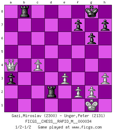 Last move : 1/2-1/2 2010 November 22 16:17:3 [Event "FICGS__CHESS__RAPID_M__000034"] [Site "FICGS"] [Date "2010.10.29"] [Round "1"] [White "Gazi,Miroslav"] [Black "Unger,Peter"] [Result "1/2-1/2"] [WhiteElo "2300"] [BlackElo "2131"] 1.d4 d5 2.c4 c6 3.Nf3 Nf6 4.e3 e6 5.Bd3 Nbd7 6.O-O dxc4 7.Bxc4 Bd6 8.Nbd2 O-O 9.Bd3 c5 10.Nc4 Be7 11.Nce5 Nxe5 12.dxe5 Nd5 13.a3 Bd7 14.Bd2 b5 15.Qe2 c4 16.Be4 a5 17.Rfd1 Qc7 18.Be1 b4 19.Rd4 Bb5 20.Qc2 g6 21.Bxd5 exd5 22.Rxd5 Bd7 23.Nd4 c3 24.bxc3 bxa3 25.c4 Be6 26.Nb5 Qb8 27.R5d1 Qxe5 28.Bc3 Qf5 29.Qa4 Bd7 30.Rd5 Bxb5 31.Rxb5 Qd3 32.Bd4 Bb4 33.Rc1 Rfd8 34.h3 Rac8 35.Bb6 Bd2 36.Rc2 Rd7 37.Bxa5 Ra8 38.Rxd2 Qxd2 39.Rb8+ Rxb8 40.Bxd2 Rxd2 1/2-1/2 QGD Slav : 4.e3 Kingside Castling by player White (move 6) Kingside Castling by player Black (move 8) This chess game ended in a draw. Follow this game move after move (download)When you absolutely don't know what to do anymore, it is time to panic. (John van der Wiel) Später, ... hatte ich zunehmend Erfolg in entscheidenden Partien. Vielleicht weil ich eine einfache Wahrheit erkannte: nicht nur ich hatte Angst, auch mein Gegner. (Mikhail Nekhemyevich Tal) Tu puedes aprender mucho mas de una partida que pierdas que de una partida ganada. Tendras que perder cientos de partidas antes de llegar a ser un buen jugador. (Jose Raul Capablanca) Des combinaisons [dans le jeu d'échecs] pareilles à des mélodies. Je crois entendre pour ainsi dire la musique des coups... (Vladimir Nabokov) Waiting for chance ? Play in casinos. (FICGS proverb)
