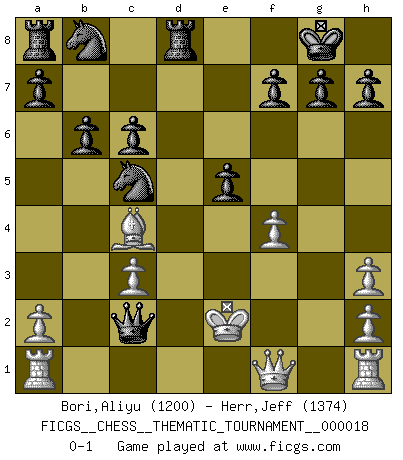 Last move : 0-1 2007 February 26 5:53:8 [Event "FICGS__CHESS__THEMATIC_TOURNAMENT__000018"] [Site "FICGS"] [Date "2006.11.27"] [Round "1"] [White "Bori,Aliyu"] [Black "Herr,Jeff"] [Result "0-1"] [WhiteElo "1200"] [BlackElo "1374"] 1.f3 d5 2.Kf2 e5 3.Nc3 c6 4.e4 d4 5.Bc4 Nf6 6.Nh3 Bxh3 7.gxh3 dxc3 8.dxc3 Bc5+ 9.Be3 Bxe3+ 10.Kxe3 Qb6+ 11.Ke2 O-O 12.Qf1 Qxb2 13.Kd2 b6 14.f4 Nxe4+ 15.Kd3 Nc5+ 16.Kd2 Rd8+ 17.Ke2 Qxc2+ 0-1 This chess game has been lost on time (started : 2006.11.27 15:50:24) Gedult's Opening Kingside Castling by player Black (move 11) Player Black won this chess game. Follow this game move after move (download)After black's reply to 1.e4 with 1..e5, leaves him always trying to get into the game. (Howard Staunton) Es genügt nicht ein guter Spieler zu sein, man muß auch gut spielen. (Siegbert Tarrasch) Un buen sacrificio es aquel que aunque no sea necesariamente sólido, deja a tu oponente aturdido y confuso. (Rudolph Spielmann) Les échecs, c'est l'art d'analyser. (Mikhail Botvinnik) Life is like a ten-speed bicycle: most of us have gears we never use. (Charles M. Schulz)