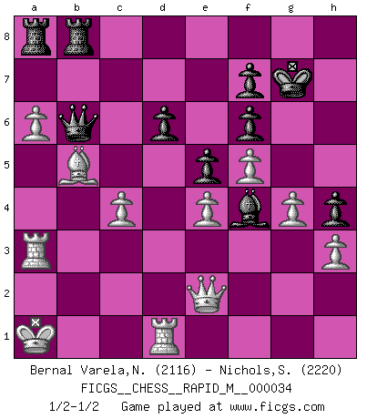 Last move : 1/2-1/2 2011 January 2 2:59:15 [Event "FICGS__CHESS__RAPID_M__000034"] [Site "FICGS"] [Date "2010.10.29"] [Round "1"] [White "Bernal Varela,Nelson"] [Black "Nichols,Scott"] [Result "1/2-1/2"] [WhiteElo "2116"] [BlackElo "2220"] 1.e4 c5 2.Nf3 d6 3.d4 cxd4 4.Nxd4 Nf6 5.Nc3 a6 6.Bg5 e6 7.f4 Qc7 8.Bxf6 gxf6 9.Qf3 b5 10.a3 Bb7 11.Be2 h5 12.O-O-O Nd7 13.f5 e5 14.Nb3 Rc8 15.Kb1 Nb6 16.Rd3 Na4 17.Rhd1 h4 18.Nc1 Bh6 19.N1a2 Nc5 20.Nd5 Qd8 21.Rc3 Bg5 22.Qg4 Kf8 23.Rh3 Na4 24.Nab4 a5 25.Bxb5 axb4 26.Bxa4 Ra8 27.Bb5 bxa3 28.bxa3 Qa5 29.Rb3 Rc8 30.c4 Qa7 31.a4 Ra8 32.Qe2 Kg7 33.Kb2 Rhc8 34.g3 Rh8 35.g4 Rhc8 36.h3 Bc6 37.Ra3 Bxd5 38.Rxd5 Qb6 39.Rb3 Rc5 40.Rd1 Rc7 41.Qe1 Rb7 42.Rd5 Rc7 43.Qd1 Rd8 44.Qe1 Ra8 45.Qd1 Rd8 46.Qe2 Ra8 47.Qd3 Rd8 48.Ra3 Qf2+ 49.Qc2 Qg1 50.a5 Ra7 51.Ka2 R7a8 52.Qe2 Qa7 53.Qe1 Qc7 54.a6 Qb6 55.Qc3 Qf2+ 56.Qb2 Qg1 57.Qe2 Qb6 58.Rd1 Rdb8 59.Qd3 Qf2+ 60.Ka1 Qb6 61.Qe2 Bf4 1/2-1/2 Sicilian : Najdorf, 7.f4 Queenside Castling by player White (move 12) This chess game ended in a draw. Follow this game move after move (download)I love all positions. Give me a difficult positional game, I will play it. But totally won positions, I cannot stand them. (Hein Donner) Kritik überlasse ich den Spießern. Ich zeige nichts, wofür ich mich schämen muss. (Alexandra Kosteniuk) Alguna parte de un error es siempre correcto. (Savielly Tartakover) Aux échecs, les retours au sommet sont rares : les dommages psychologiques consécutifs à une défaite sont trop sévères. (Daily Telegraph) As a goal marker shodan is important. As a destination it is a poor place to stop. (Thomas Tamayo)