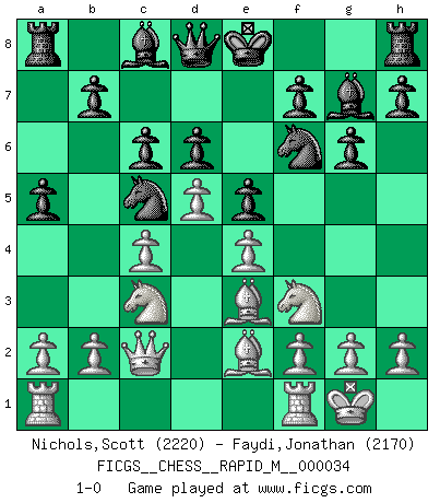 Last move : 1-0 2010 October 31 16:10:15 [Event "FICGS__CHESS__RAPID_M__000034"] [Site "FICGS"] [Date "2010.10.29"] [Round "1"] [White "Nichols,Scott"] [Black "Faydi,Jonathan"] [Result "1-0"] [WhiteElo "2220"] [BlackElo "2170"] 1.Nf3 d6 2.d4 c6 3.c4 Nf6 4.Nc3 Nbd7 5.e4 e5 6.Be2 g6 7.O-O Bg7 8.d5 Nc5 9.Qc2 a5 10.Be3 1-0 Reti Opening Kingside Castling by player White (move 7) Player White won this chess game. Follow this game move after move (download)When I have White, I win because I am white; When I have Black, I win because I am Bogolyubov. (Bogolyubov) Schach ist Krieg, im Schach geht es um testosterongesteuerte Urschreie. (Garry Kasparov) Yo he agregado estos principios a la ley: pongan los Caballos en acción antes de que los dos Alfiles sean desarrollados. (Emanuel Lasker) Il a essayé de se convaincre qu'il pourrait empêcher toutes les erreurs et ne jamais perdre. L'horreur ! Gary Kasparov au sujet de Robert Fischer. He who fights with monsters should be careful lest he thereby become a monster. (Friedrich Nietzsche, Beyond Good and Evil)