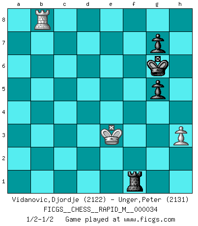 Last move : 1/2-1/2 2010 November 14 16:35:41 [Event "FICGS__CHESS__RAPID_M__000034"] [Site "FICGS"] [Date "2010.10.29"] [Round "1"] [White "Vidanovic,Djordje"] [Black "Unger,Peter"] [Result "1/2-1/2"] [WhiteElo "2122"] [BlackElo "2131"] 1.d4 d5 2.c4 c6 3.Nf3 Nf6 4.Nc3 e6 5.a4 a6 6.Bg5 a5 7.e3 Be7 8.Be2 Na6 9.O-O O-O 10.Qb3 Nb4 11.Rac1 h6 12.Bh4 b6 13.cxd5 exd5 14.Ne5 Bb7 15.Rfe1 Nd7 16.Bxe7 Qxe7 17.Nxd7 Qxd7 18.Na2 Qd6 19.Nxb4 axb4 20.Qd1 Rfc8 21.b3 Rc7 22.Qd2 Bc8 23.h3 Bf5 24.Bf3 Rac8 25.Red1 Qe7 26.g4 Be6 27.Qd3 Qh4 28.Kg2 Rf8 29.e4 dxe4 30.Bxe4 f5 31.gxf5 Qg5+ 32.Qg3 Bxb3 33.Qxg5 hxg5 34.Rd2 Bxa4 35.Rb2 c5 36.Rxb4 Bc6 37.Bxc6 Rxc6 38.dxc5 bxc5 39.Rb7 R6c8 40.Ra1 Rf7 41.R1a7 Rxb7 42.Rxb7 c4 43.Kf3 c3 44.Rb1 Rc4 45.Ke2 Kf7 46.Kd3 Rf4 47.Kxc3 Rxf2 48.Kd4 Rxf5 49.Ke3 Kg6 50.Rb8 Rf1 1/2-1/2 QGD Slav : 4.Nc3 Kingside Castling by player White (move 9) Kingside Castling by player Black (move 9) 10 pieces endgame at move 42 : White KRPPP , Black KRPPP WHITE : King + 1 Rook 3 Pawns BLACK : King + 1 Rook 3 Pawns 9 pieces endgame at move 47 : White KRPPP , Black KRPP WHITE : King + 1 Rook 3 Pawns BLACK : King + 1 Rook 2 Pawns 8 pieces endgame at move 47 : White KRPP , Black KRPP WHITE : King + 1 Rook 2 Pawns BLACK : King + 1 Rook 2 Pawns 7 pieces endgame at move 48 : White KRP , Black KRPP WHITE : King + 1 Rook 1 Pawn BLACK : King + 1 Rook 2 Pawns This chess game ended in a draw. Follow this game move after move (download)A big shock; the best chess player in history has passed away. (Lajos Portisch, about Bobby Fischer's death) In Buenos Aires ist es nicht mein vorrangiges Ziel ein starkes Turnier zu organisieren, sondern ein Turnier für Gentlemen. Ich würde nie Kamsky einladen. Ich mag keine Probleme. (Miguel Najdorf) El Ajedrez es 99 por ciento táctica. (Teichmann) Toutes les manuvres exécutées sur une colonne ouverte ont pour but ultime l'intrusion définitive sur la septième ou la huitième rangée, en plein cur de la position ennemie. (Aaron Nimzovitch) You can't play chess if you're groggy from pills. (Anatoly Karpov)