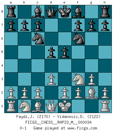 Last move : 0-1 2010 November 1 4:58:15 [Event "FICGS__CHESS__RAPID_M__000034"] [Site "FICGS"] [Date "2010.10.29"] [Round "1"] [White "Faydi,Jonathan"] [Black "Vidanovic,Djordje"] [Result "0-1"] [WhiteElo "2170"] [BlackElo "2122"] 1.g3 d5 2.Bg2 Nf6 3.d3 e5 4.Nf3 Nc6 0-1 Benko's Opening Player Black won this chess game. Follow this game move after move (download)The winner of the game is the player who makes the next-to-last mistake. (Savielly Tartakover) Es ist im Leben wie im Schachspiel. Wir entwerfen einen Plan, dieser bleibt jedoch bedingt durch das, was im Schachspiel dem Gegner, im Leben dem Schicksal zu tun belieben wird. (Arthur Schopenhauer) La táctica fluye a partir de una posición superior. (Bobby Fischer) Lorsque vous vous retrouvez devant une position atroce, ne tendez pas un ultime piège dérisoire avec l'intention d'abandonner si l'adversaire le déjoue ! Faites-vous plutôt un devoir de résister comme si votre vie en dépendait. Jouez le coup qui vous déplairait au centuple si vous étiez dans la peau de votre tortionnaire ! Remember : Your focus determines your reality. (Qui-Gon Jinn in Star Wars ep.1)