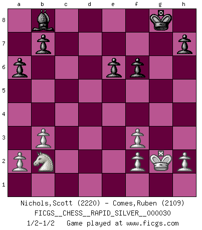Last move : 1/2-1/2 2010 November 22 15:34:30 [Event "FICGS__CHESS__RAPID_SILVER__000030"] [Site "FICGS"] [Date "2010.10.29"] [Round "2"] [White "Nichols,Scott"] [Black "Comes,Ruben"] [Result "1/2-1/2"] [WhiteElo "2220"] [BlackElo "2109"] 1.Nf3 c5 2.c4 Nc6 3.d4 cxd4 4.Nxd4 e6 5.Nc3 Bc5 6.e3 Nf6 7.Be2 O-O 8.O-O d5 9.cxd5 exd5 10.Nf3 Be6 11.b3 Rc8 12.Bb2 Qe7 13.Rc1 a6 14.Bd3 Rfd8 15.Na4 Ba7 16.Ng5 d4 17.Nxe6 Qxe6 18.exd4 Nxd4 19.Rxc8 Qxc8 20.Nc3 Qe6 21.Re1 Nf3+ 22.gxf3 Rxd3 23.Rxe6 Rxd1+ 24.Nxd1 fxe6 25.Bxf6 gxf6 26.Kg2 Bb8 27.Nb2 1/2-1/2 Reti Opening Kingside Castling by player Black (move 7) Kingside Castling by player White (move 8) This chess game ended in a draw. Follow this game move after move (download)I had a toothache during the first game. In the second game I had a headache. In the third game it was an attack of rheumatism. In the fourth game, I wasn't feeling well. And in the fifth game? Well, must one have to win every game ? (Siegbert Tarrasch) Über Kasparov: Es ist offensichtlich, daß er in einem totalitären Staat aufwuchs und deshalb zu diktatorischen Zügen neigt. (Viktor Kortschnoi) La pasion por jugar al Ajedrez es una de las mas inexplicables en el mundo. (H.G. Wells) Des combinaisons [dans le jeu d'échecs] pareilles à des mélodies. Je crois entendre pour ainsi dire la musique des coups... (Vladimir Nabokov) The project of the man are lower than those of the sky. (Chinese proverb)