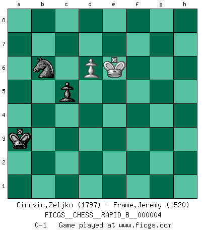 Last move : 0-1 2006 May 31 22:53:11 [Event "FICGS__CHESS__RAPID_B__000004"] [Site "FICGS"] [Date "2006.04.30"] [Round "1"] [White "Cirovic,Zeljko"] [Black "Frame,Jeremy"] [Result "0-1"] [WhiteElo "1797"] [BlackElo "1520"] 1.e4 e5 2.Nf3 Nf6 3.Nxe5 d6 4.Nf3 Nxe4 5.d4 d5 6.Bd3 Bf5 7.Nbd2 Be7 8.O-O Nxd2 9.Qxd2 Bxd3 10.Qxd3 O-O 11.Re1 Re8 12.Bg5 Bxg5 13.Rxe8+ Qxe8 14.Re1 Be7 15.Ng5 g6 16.Qh3 h5 17.g4 Nc6 18.gxh5 Qf8 19.hxg6 Qg7 20.gxf7+ Kf8 21.f4 Bxg5 22.fxg5 Qxg5+ 23.Kh1 Kxf7 24.Qf3+ Qf6 25.Qxd5+ Kf8 26.c3 Re8 27.Rg1 Qe6 28.Qg5 Qe4+ 29.Rg2 Qe1+ 30.Rg1 Qe4+ 31.Rg2 Kf7 32.h4 Ke6 33.Kh2 Kd7 34.d5 Ne7 35.Rg4 Qe2+ 36.Rg2 Qc4 37.h5 Rg8 38.Qd2 Qh4+ 39.Kg1 Rxg2+ 40.Qxg2 Qxh5 41.c4 Qg6 42.Qxg6 Nxg6 43.Kf2 Ne5 44.b3 Kd6 45.Ke3 Kc5 46.Ke4 Nd7 47.a3 a5 48.Kd3 b5 49.cxb5 Kxb5 50.Kd4 a4 51.bxa4+ Kxa4 52.d6 c6 53.Ke4 Kxa3 54.Kf5 Nb6 55.Ke6 c5 0-1 Petrov : Classical attack Kingside Castling by player White (move 8) Kingside Castling by player Black (move 10) 10 pieces endgame at move 42 : White KPPPP , Black KNPPP WHITE : King + 4 Pawns BLACK : King + 1 Knight 3 Pawns 9 pieces endgame at move 49 : White KPPPP , Black KNPP WHITE : King + 4 Pawns BLACK : King + 1 Knight 2 Pawns 8 pieces endgame at move 49 : White KPPP , Black KNPP WHITE : King + 3 Pawns BLACK : King + 1 Knight 2 Pawns 7 pieces endgame at move 51 : White KPPP , Black KNP WHITE : King + 3 Pawns BLACK : King + 1 Knight 1 Pawn 6 pieces endgame at move 51 : White KPP , Black KNP WHITE : King + 2 Pawns BLACK : King + 1 Knight 1 Pawn 5 pieces endgame at move 53 : White KP , Black KNP WHITE : King + 1 Pawn BLACK : King + 1 Knight 1 Pawn Player Black won this chess game. Follow this game move after move (download)A win by an unsound combination, however showy, fills me with artistic horror. (Wilhelm Steinitz) Kritik überlasse ich den Spießern. Ich zeige nichts, wofür ich mich schämen muss. (Alexandra Kosteniuk) De eso se trata el Ajedrez. Un día le das una lección a tu oponente y al día siguiente el te da una a tí. (Bobby Fischer) À la honte des hommes, on sait que les lois du jeu sont les seules qui soient partout justes, claires, inviolables et exécutées. Pourquoi l'Indien qui a donné les règles du jeu d'échecs est-il obéi de bon gré dans toute la terre, et que les décrétales des papes, par exemple, sont aujourd'hui un objet d'horreur et de mépris ? C'est que l'inventeur des échecs combina tout avec justesse pour la satisfaction des joueurs, et que les papes, dans leurs décrétales, n'eurent en vue que leur seul avantage. L'Indien voulut exercer également l'esprit des hommes et leur donner du plaisir; les papes ont voulu abrutir l'esprit des hommes. Voltaire (Dictionnaire philosophique / Garnier 1967) . 'gn is not allowed in chess unless n is an integer between 1 and 8 inclusive, where 1 and 8 are to interpreted as the standard numerals standing for integers in the ordered real-closed field R, with the *canonical* ordering. (As opposed to, say, an integer in the domain Z[2+i*sqrt(5)] or an integer in some exotic Grothendieck topos). (Normajean Yates)